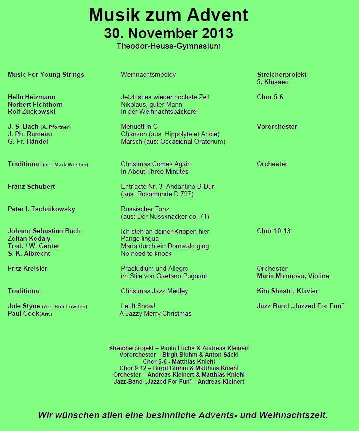 Am Samstag, den 30.11.2013 fand, wie jedes Jahr, das THG-Adventskonzert statt. In der Aula musizierten das Streicherprojekt, der Chor der 5. und 6. Klassen, das Vororchester, das Orchester sowie der Chor der Jahrgangstufen 9-12, Solokünstler und die Jazz-Band „Jazzed For Fun“, insgesamt gut 200 Mitwirkende , die dem aufmerksam lauschenden Publikum eine schöne, entspannende Einstimmung in die Adventszeit 2013 bereiteten.