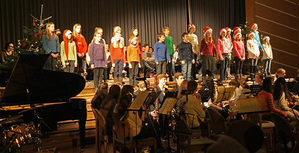 Eine überraschend professionelle Improvisation boten Kim Shastri am Klavier und, als Überraschungsgast, ein gewisser Gregor am Saxophon, bevor als Ausklang die Jazz-Band „Jazzed For Fun“ dem Adventskonzert einen beschwingten Schlusspunkt setzte. Die Schulleiterin Frau Dr. Koller verteilte an die mitwirkenden Lehrer und Schüler große und kleine Weihnachtsmänner.