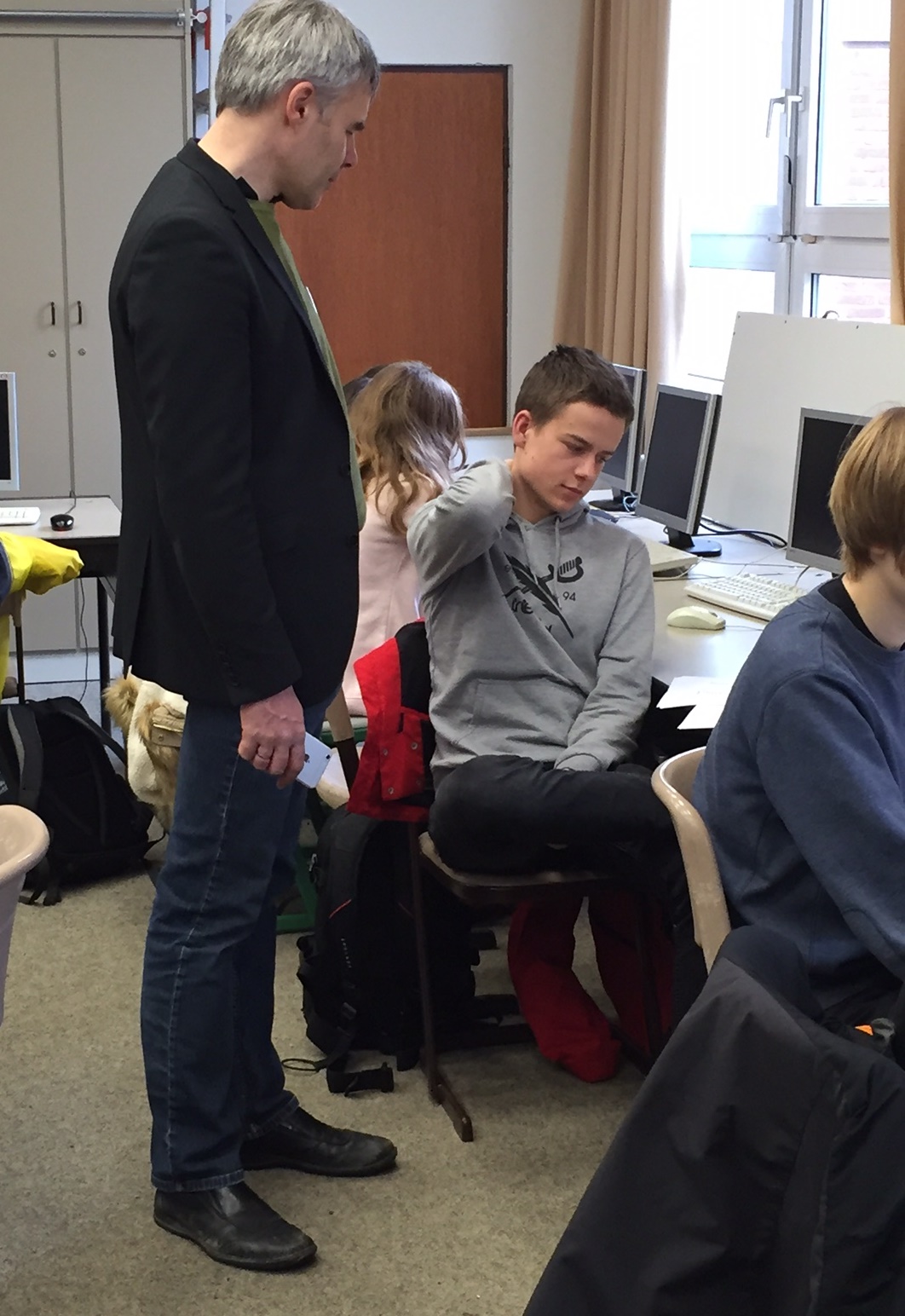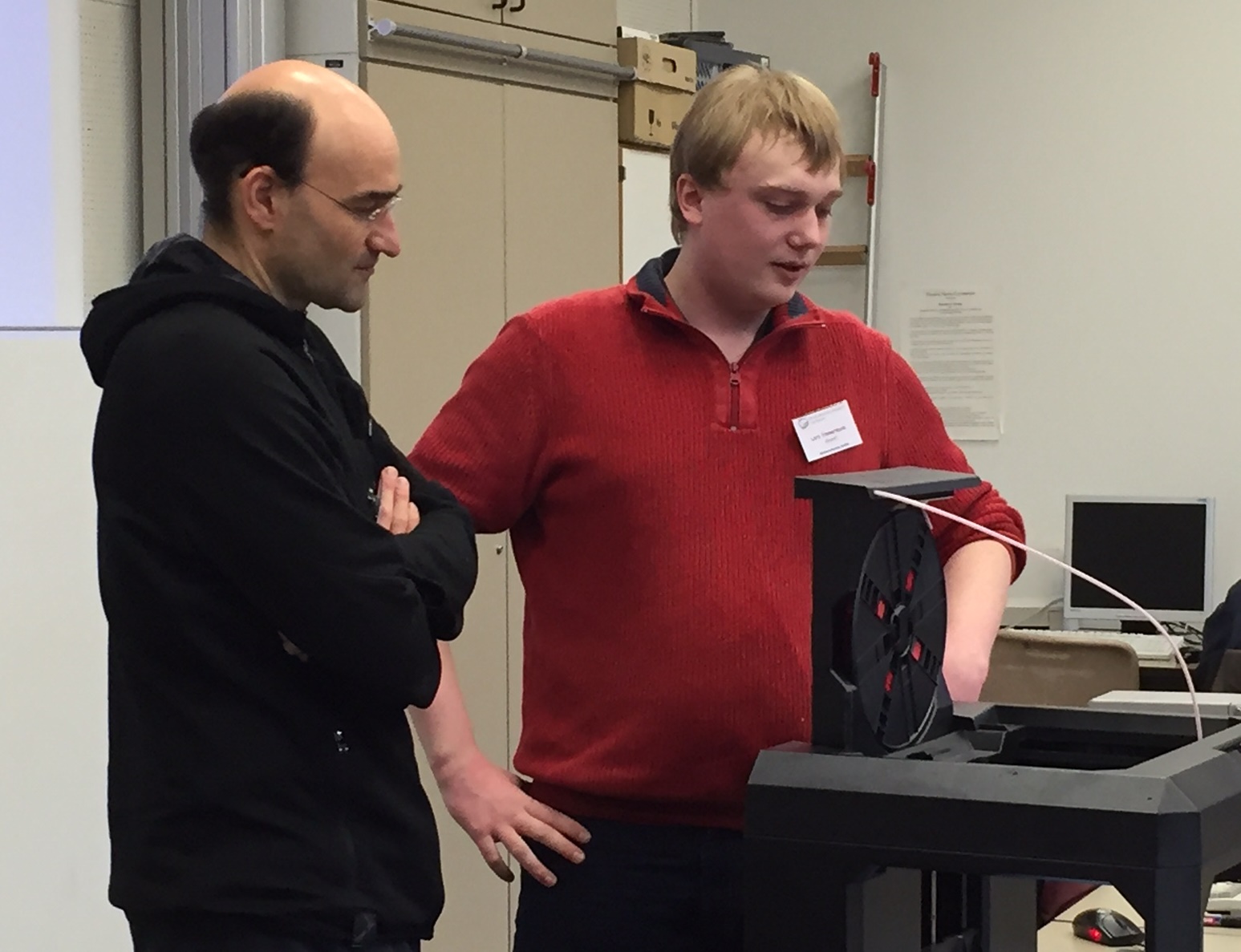Da seit seiner Erfindung 1983 die Bedeutung des 3D Drucks in vielen Anwendungsbereichen von der Architektur bis zum Automobilbau immer weiter zunimmt, war es für 15 Schülerinnen und Schüler der Jahrgänge 7 bis 11 spannend, von Herrn Halverscheid, Professor der Mathematikdidaktik der Universität Göttingen, eine erste Einführung in die mathematischen Grundlagen der 3D-Modellierung zu bekommen. Unterstützt von Prof. Halverscheids Mitarbeiter Dr. Wiedmann und dem Studenten Lars Emmermann hatten die interessierten Nachwuchsmathematiker die Möglichkeit, auf einem mitgebrachten 3D-Drucker – stolze 2500€ wert –  eigene einfache 3D-Modelle zu drucken, aus Kunststoff, neben Kunstharz und Keramik der am häufigsten verwendete Werkstoff beim 3D-Druck. Letzterer erinnerte die Berichterstatterin daran, wo sie zum ersten Mal “live” Kontakt mit einem solchen Drucker hatte – beim Zahnarzt. Somit stellte sich dann die Verbindung zwischen theoretischen Grundlagen und praktischer Anwendung aufs Anschaulichste her …
