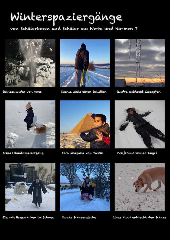 Rechtzeitig bevor Plusgrade den Schnee wieder zum Schmelzen bringen, ist es den Werte und Normen – Kursen von Frau Günzel gelungen, ihre Arbeitsaufträge in die Tat bzw. “in den Schnee” (um)zusetzen. So haben sich die Schüler*innen aus dem 5. Jahrgang sehr kreativ am “Klassiker”, dem Schneemann, versucht. Natürlich müssen die Männer aus Schnee heutzutage nicht allein in der Landschaft herumstehen – kühle Damen in Weiß gesellen sich zu ihnen! Da waren der Fantasie keine Grenzen gesetzt und das eine oder andere Accessoire wurde bestimmt irgendwo vermisst … Nicht weniger ideenreich war die WN-Klasse 6, die sich sehr erfolgreich an Burgen, Schlössern und Tunnels versucht hat. Nicht unerhebliche Massen an Schnee wurde bewegt und am Ende entstanden unter den geschickten Händen der jungen Schneearchitekt*innen auch noch ein paar Schneemänner, Schneerutschen oder Fantasiegebilde. In nichts stehen dem die “Winterspaziergänger*innen” aus dem 7. Jahrgang nach, die gezeigt haben, dass es mitten in den Schneemassen, gleich neben den dicken Eiszapfen, eine, ja wirklich!, Pyramide zu entdecken gibt. Glückwunsch zu diesen tollen winterlichen Kreationen an alle Beteiligten !