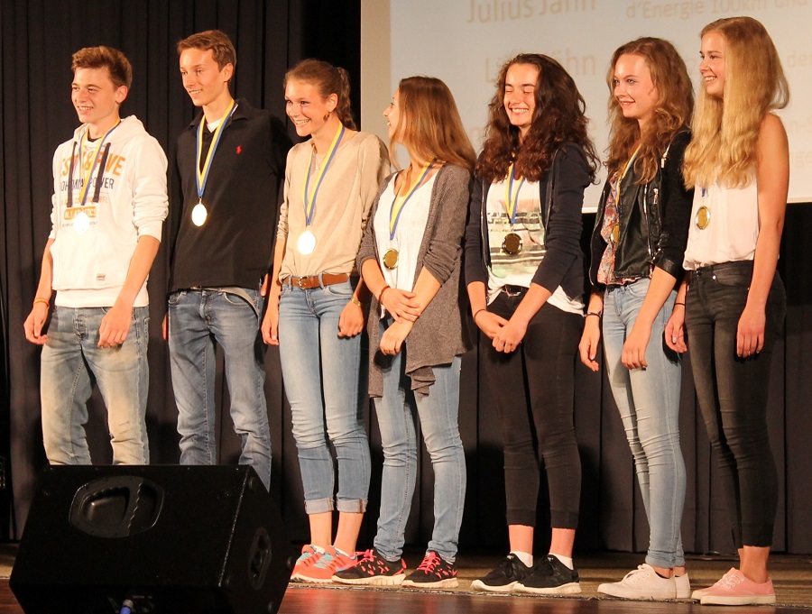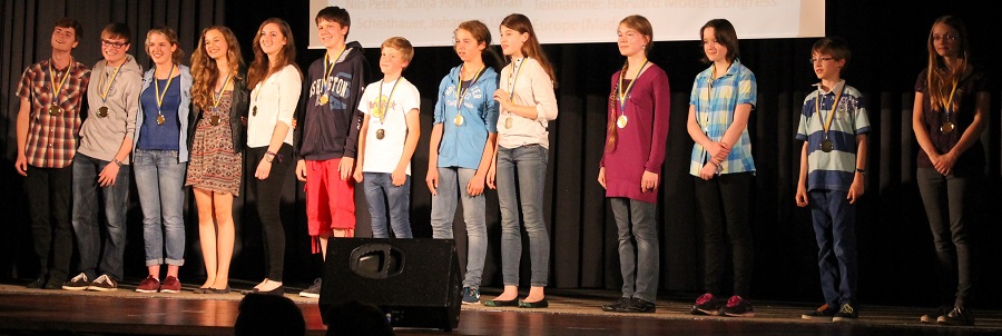 Eine Bühne, auf der dicht gedrängt Talente stehen und auf eine vielleicht ganz große Zukunft blicken. Wo gibt‘s das schon? Natürlich bei unserem großen Forum "THG hat Talent", das am Donnerstag, dem 10. Juli, in der Aula unserer Schule stattfand. Schülerinnen und Schüler aller Jahrgangsstufen nahmen den von der Sparkasse Göttingen gesponserten "Theo d’or" in 8 verschiedenen Kategorien in Empfang und die moderierenden Lehrer Frau Meyfahrt und Herr Schlegel konnten so den anwesenden Mitschülern und Kollegen, Freunden und Eltern zeigen, welche Talente in so manchem THGler schlummern, Talente, die im Schulalltag zwischen Algebra und Aufsatz oft nicht die gebührende Aufmerksamkeit finden.