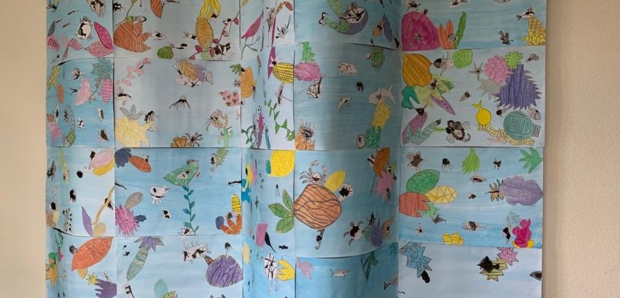 Wer möchte nicht gern ab und zu die Augen von der Büroarbeit wenden und bunten Fischen zuschauen, die in einem riesigen Aquarium ihre Runden ziehen? Gerade jetzt, wo eine Reise zu den “richtigen” Meeren mit den echten Fischen noch in sehr weiter Ferne zu sein scheint, hat sich unsere Schulleiterin Frau Riedel einen wahren “Kunstschatz” geangelt und noch dazu im THG, wo es im Augenblick nicht einmal eine Regenpfütze gibt! Zu verdanken hat die Schulleiterin dieses blaue Highlight der Klasse 6A, die unter Anleitung ihres Kunstlehrers Christian Tegelkamp aus vielen Einzelzeichnungen ein großes Wandbild gestaltet hat – mit einer Welle aus Papier, die das bunte Treiben lebendig erscheinen lässt und manchem Gast im Direktorinnenzimmer bestimmt gleich zu guter Laune verhilft.