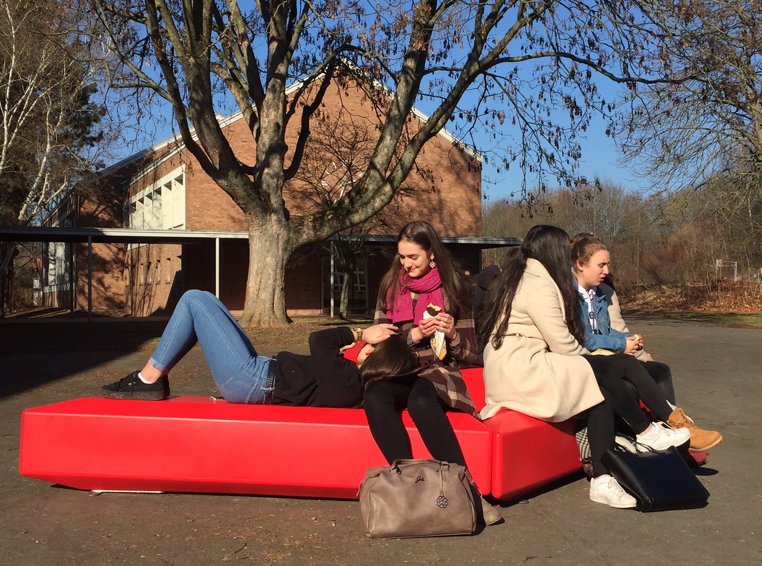 Mit tatkräftiger Unterstützung des Fördervereins konnten mehrere farbenfrohe Sitzelemente für unsere Schule angeschafft werden, die nun auf dem Schulhof und in der hinteren Pausenhalle so manchem entspannungsbedürftigen THGler einen Platz zum Quatschen, Chillen oder Sonnen bieten. In jedem Fall wurden sie quasi in den ersten Sekunden nach ihrer Aufstellung mit Beschlag belegt und trotzen mit robustem Kunststoff und der nötigen "Erdenschwere" hoffentlich sehr lange dem Wetter und der Jugend!