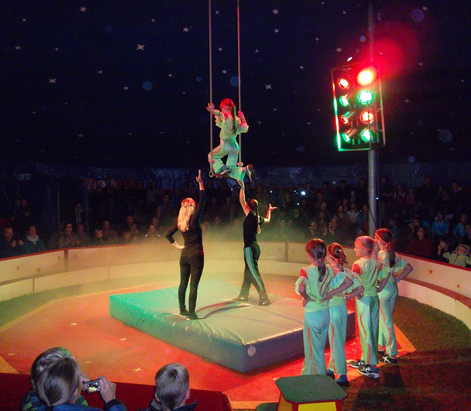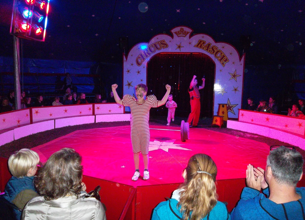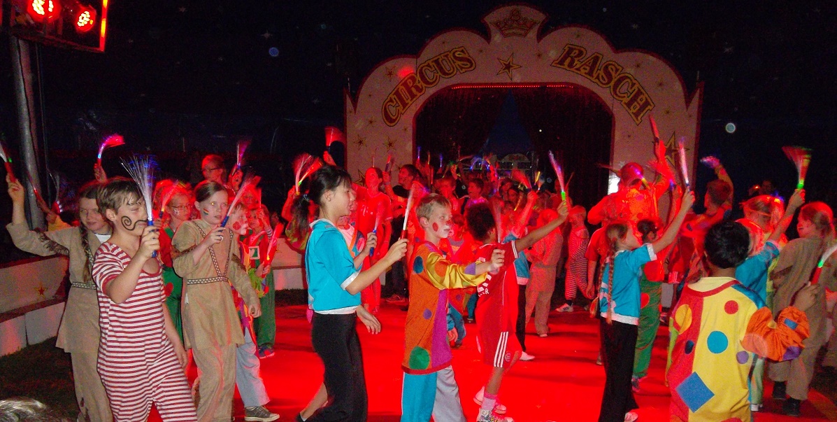 An je einem Vormittag trainierte und probte jede Klasse ganz neue Disziplinen: Trapezübungen standen auf dem Programm, Fußballchoreografien mit Pfiff wurden von den „Trampolinos“ kreiert, das Zirkuspony trug junge Artisten durch die Manege und natürlich brachten zahlreiche Clowns die Zuschauer zum Lachen. Und von denen gab es reichlich, denn am Abend öffnete sich das Zirkuszelt für Familie, Freunde oder Lehrer, die gemeinsam die Kunststücke des zirzensischen Nachwuchses bestaunen konnten. Und nicht wenige Mütter erzitterten kurz als ihre Kinder über Scherben und Nägel liefen oder Feuer mit der bloßen Hand löschten! Sie konnten vom jungen zirkuserfahrenen Publikum beruhigt werden: nur Schein und Zirkus-Effekte. Dennoch, was an Akrobatik und Zaubertricks geboten wurde, spricht sehr für das pädagogische Geschick und die lange Erfahrung der „Teilzeitlehrer- und Lehrerinnen“ des Zirkus Rasch, die in kürzester Zeit tolle Ergebnisse erzielten und ihren Zirkusschülern außerdem noch eine Menge Spaß bescherten.