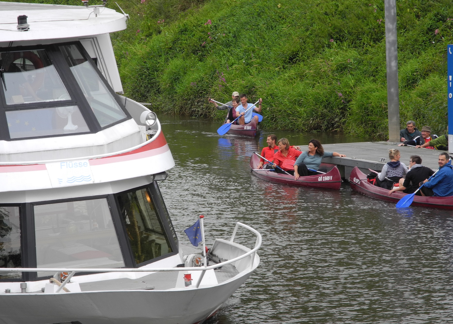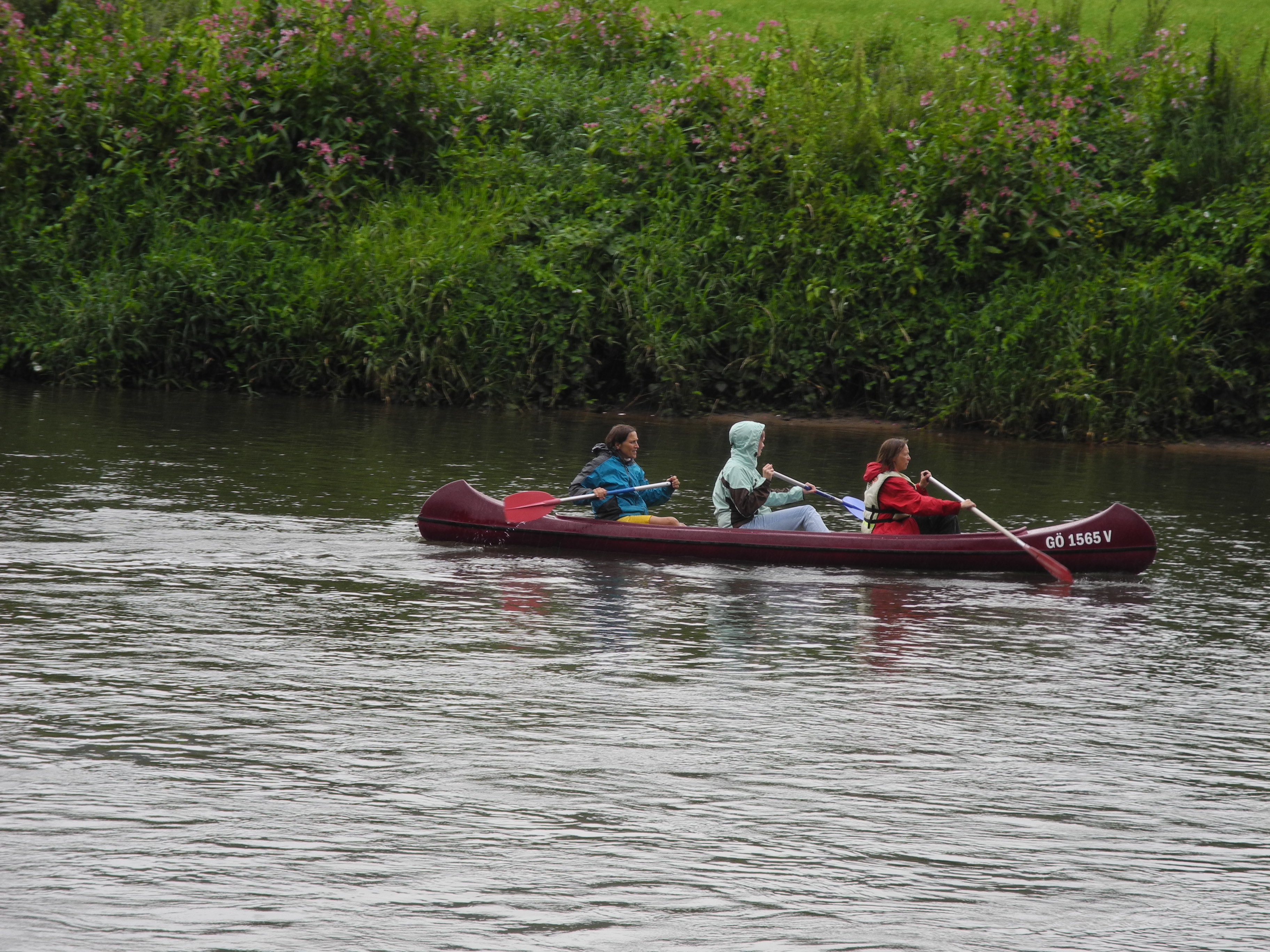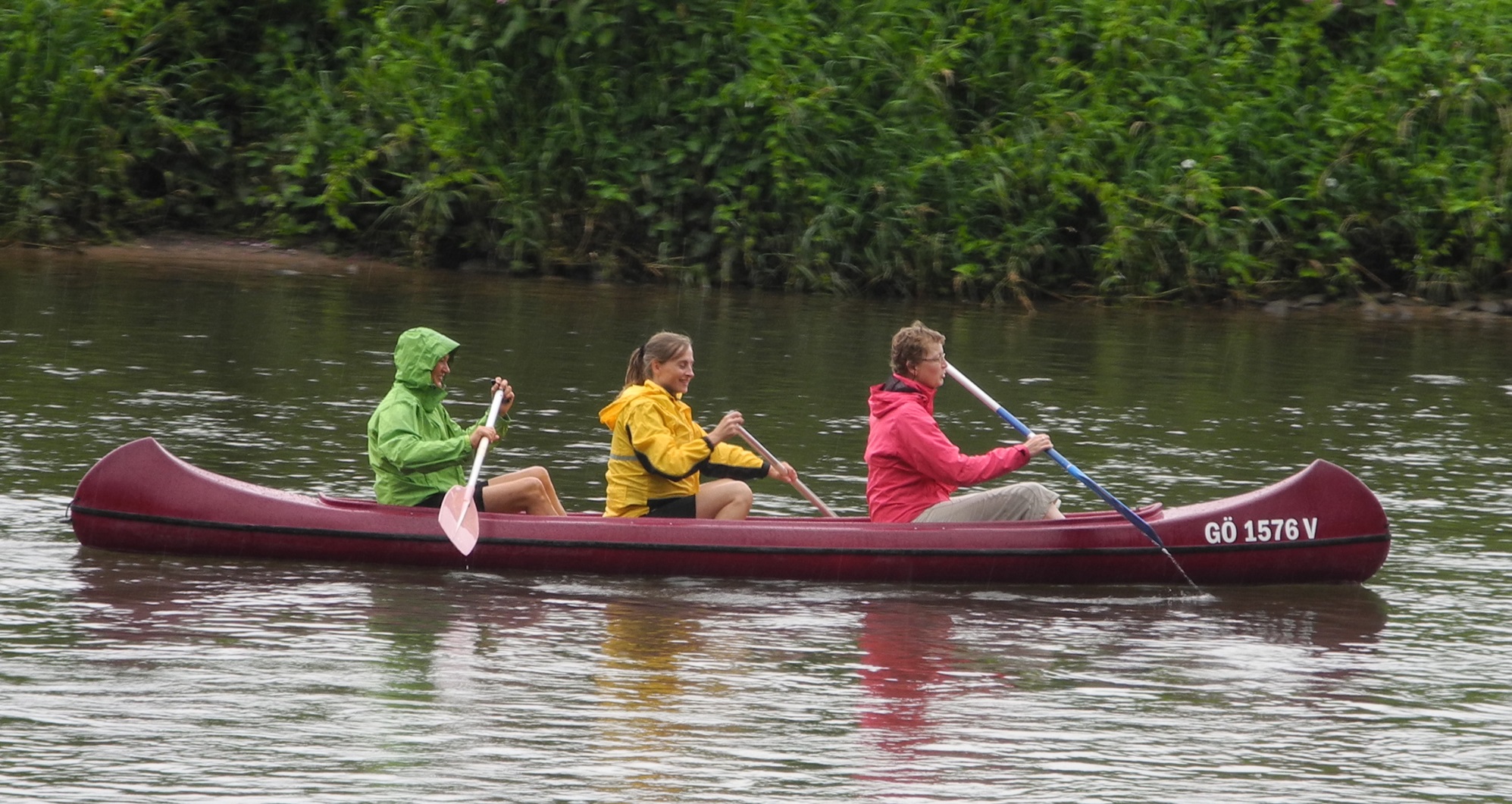 Einen Tag vor Schulbeginn steht traditionsgemäß nicht nur die Dienstberatung auf dem Programm, sondern auch ein Ausflug des Kollegiums, der in diesem Jahr eine echte Outdoor-Aktivität war. Unser neuer Personalrat hatte sich mächtig ins Zeug gelegt, um seine „Legislaturperiode“ mit einem Paukenschlag bzw. einem Paddelschlag zu beginnen. Obwohl es schon während der Fahrt nach Hann.Münden tröpfelte, konnte die Stimmung nicht besser sein, zumal wir mit Brezeln, Äpfeln und Schokolade für die kommende sportliche Herausforderung fit gemacht wurden. Nachdem die doch recht abwechslungsreichen Paddel-Outfits angelegt und die Belehrung durchgeführt waren, wurden die Boote zu Wasser gelassen und die Dreiergruppen versuchten, auch wirklich das qualifizierteste Crewmitglied ans Steuer zu setzen. Dass es nicht immer gelang, zeigten diverse Kontakte mit der Uferböschung …Dennoch wurden alle größeren Wasserfahrzeuge bzw. Schwan- und Entenfamilien unfallfrei umschifft und selbst der zunehmende Regen konnte nicht verhindern, dass in den Booten doch mächtig gegackert und gealbert wurde, aber es war ja quasi noch Pause, da darf man das, oder?