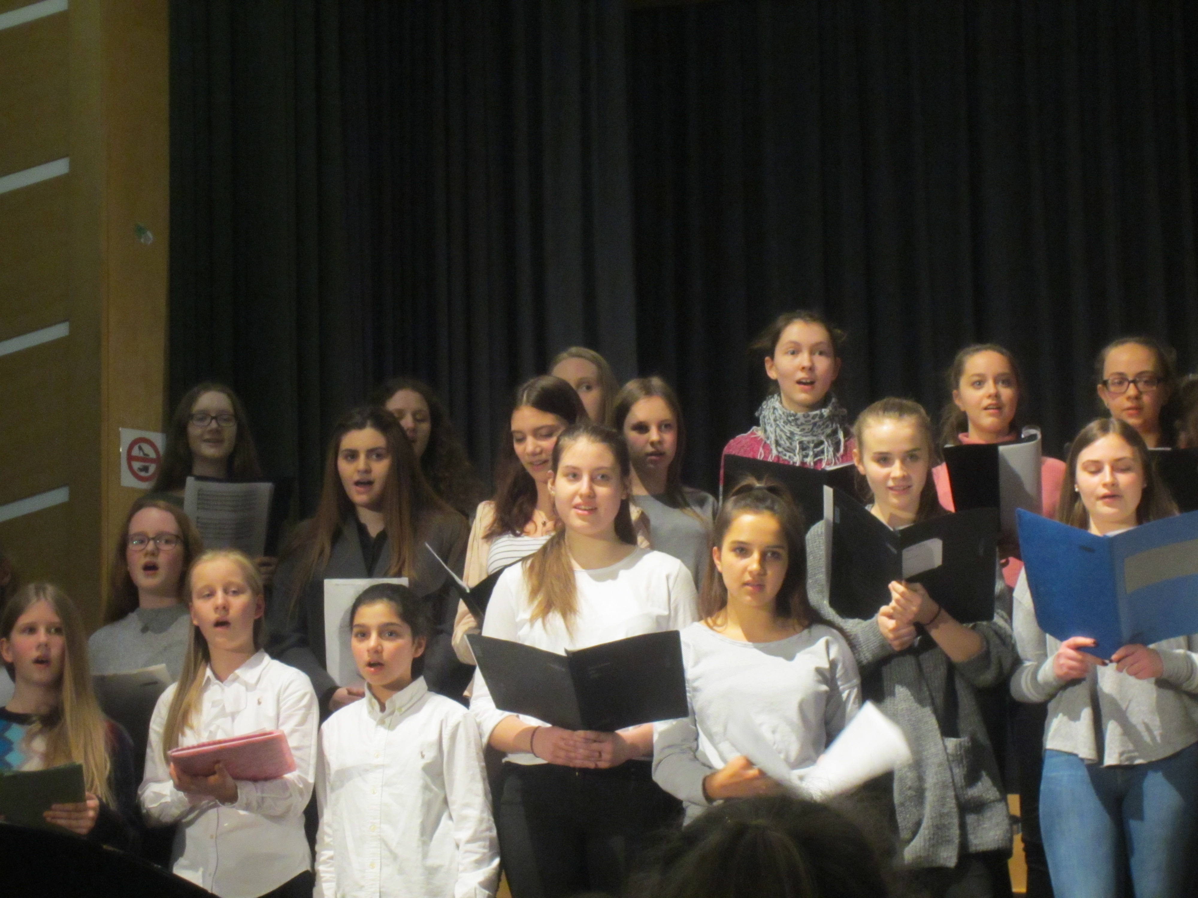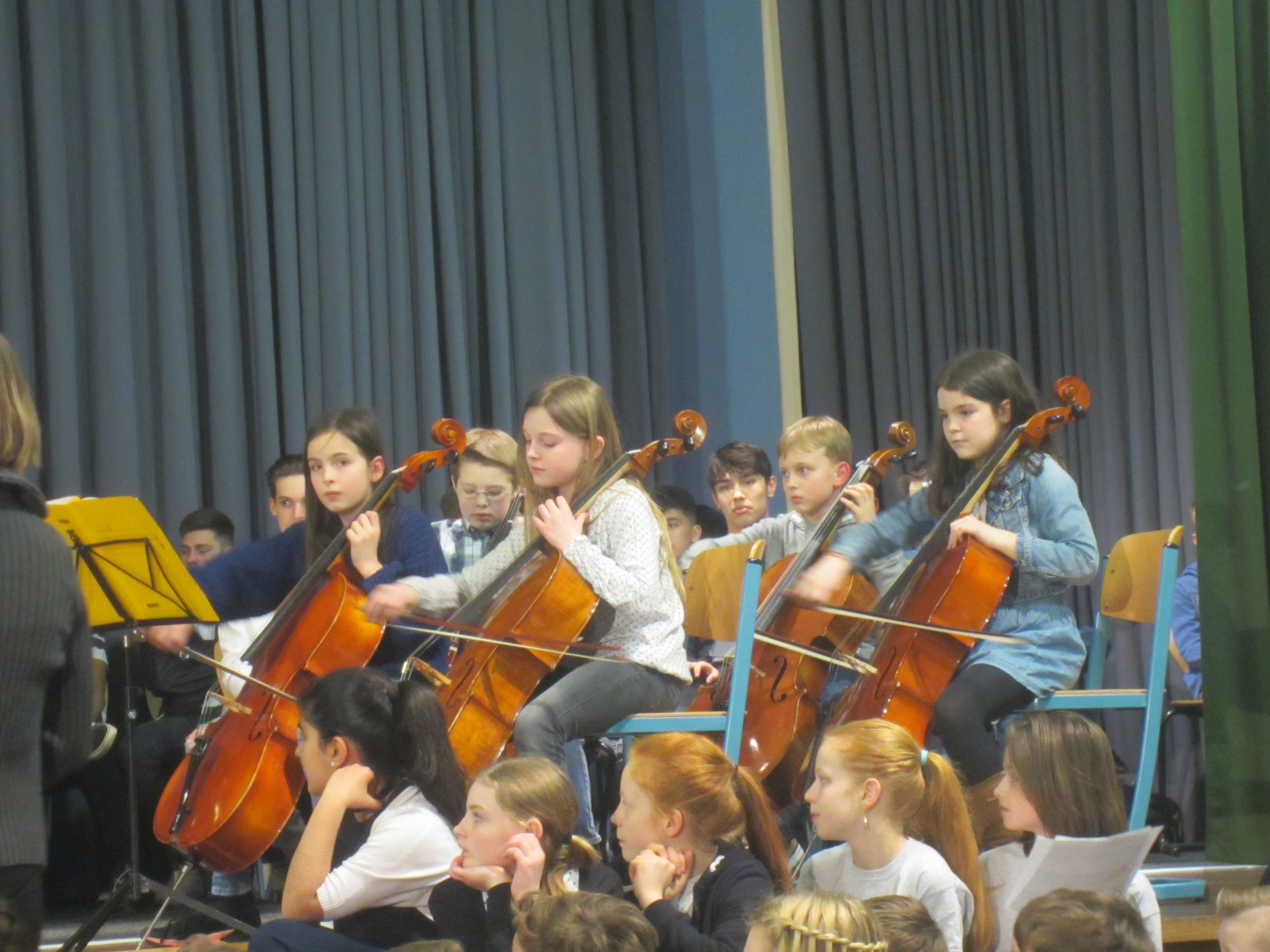 Eröffnet wurde das Konzert von dem Streicherprojekt der fünften Klassen mit einer „Musikalischen Weltreise“. Die Musik aus dem Wilden Westen mischte die Stimmung im Saal schnell auf. Auch der darauf folgende Chor der fünften Klassen wurde mit großem Applaus beglückt. Insbesondere bei der Version von „Over The Rainbow“ applaudierte das Publikum begeistert.