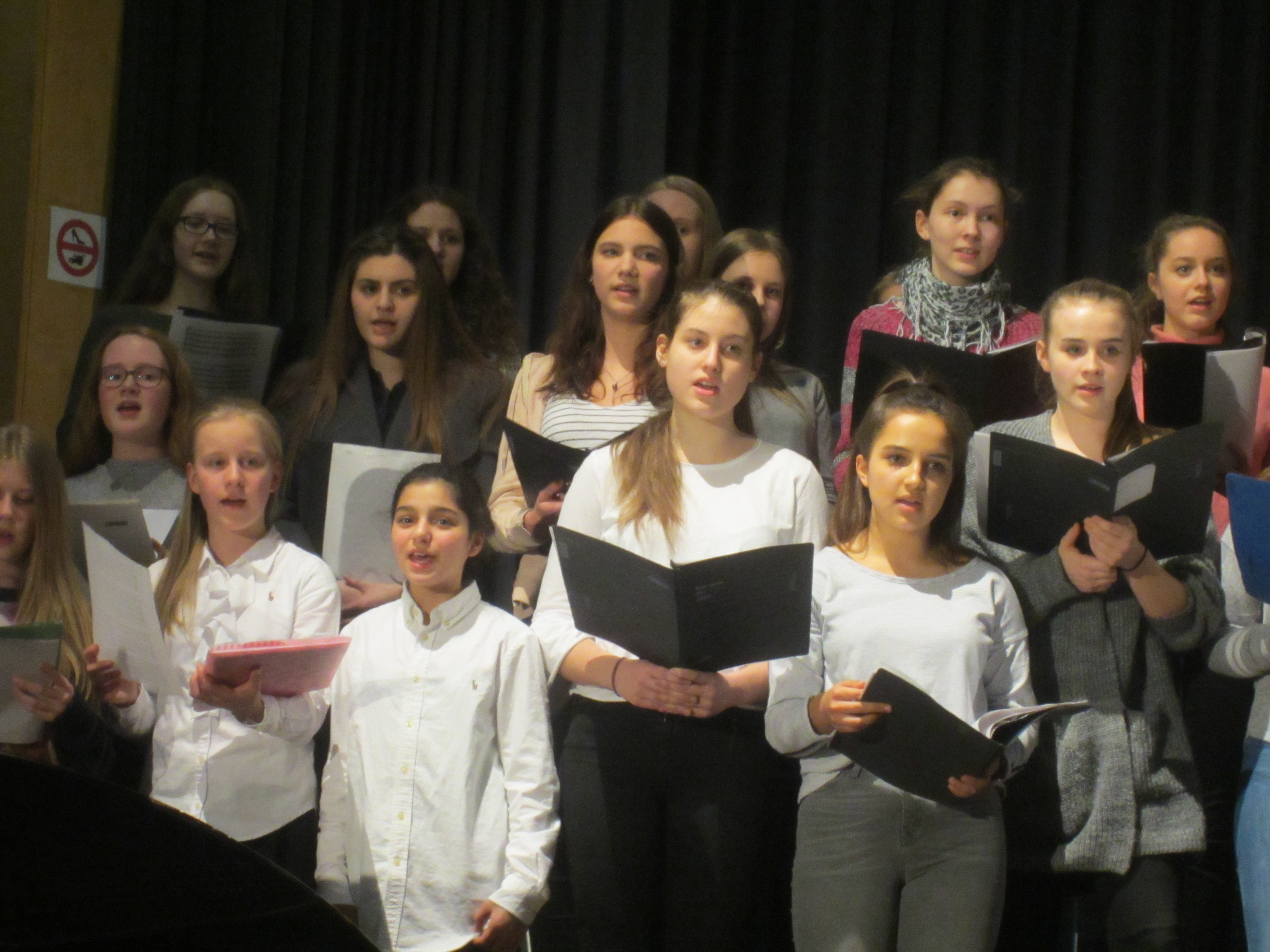 Zur Überraschung des Publikums sang die Chor-AG von der oberen Tribüne der Aula. Die SchülerInnen der Klassen fünf und sechs begeisterten das Publikum mit einem Kanon „Miau!“.