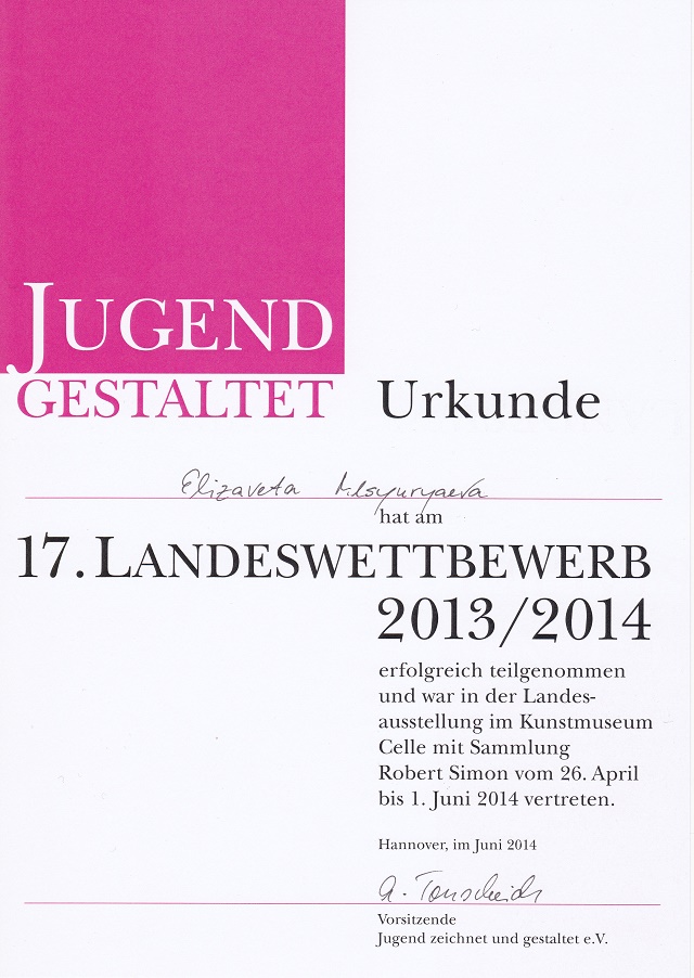 … sondern braucht auch die Kunst! Und so ist das THG rundum bestens versorgt, denn unsere Schülerin Liza Misyuryaeva aus dem Jahrgang Q1 hat mit ihrer Arbeit „Astrum“, die vom 26.4. bis zum 1.6. 2014 im Landesmuseum Celle ausgestellt war, erfolgreich am 17. Landeswettbewerb Jugend gestaltet teilgenommen.