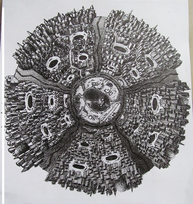 Die Idee zu diesem Bild kam, so Liza, als sie das Foto einer runden Muschel gesehen hat, deren Oberfläche aussah, als bestünde sie aus Hochhäusern und Straßen. Ihre Arbeit erzählt eine Geschichte, die in der Zukunft stattfindet, in ein paar Jahrhunderten, aber vielleicht auch schon morgen: „Abgebildet ist der Planet Astrum, ein Rückzugsort der Superreichen. Die riesige Kugel wurde auf Wunsch einer Elite gebaut, die dem aufkommenden, gewaltigen Krieg entfliehen wollte. Seitdem kreist sie wie eine Sonne um den einst blauen, wegen des Krieges nun braunen Planeten. Aber der lange Krieg hat die Menschen auf der Erde nicht nur stumpf, sondern auch kreativ gemacht. Sie tun alles, damit das Chaos ein Ende findet.“