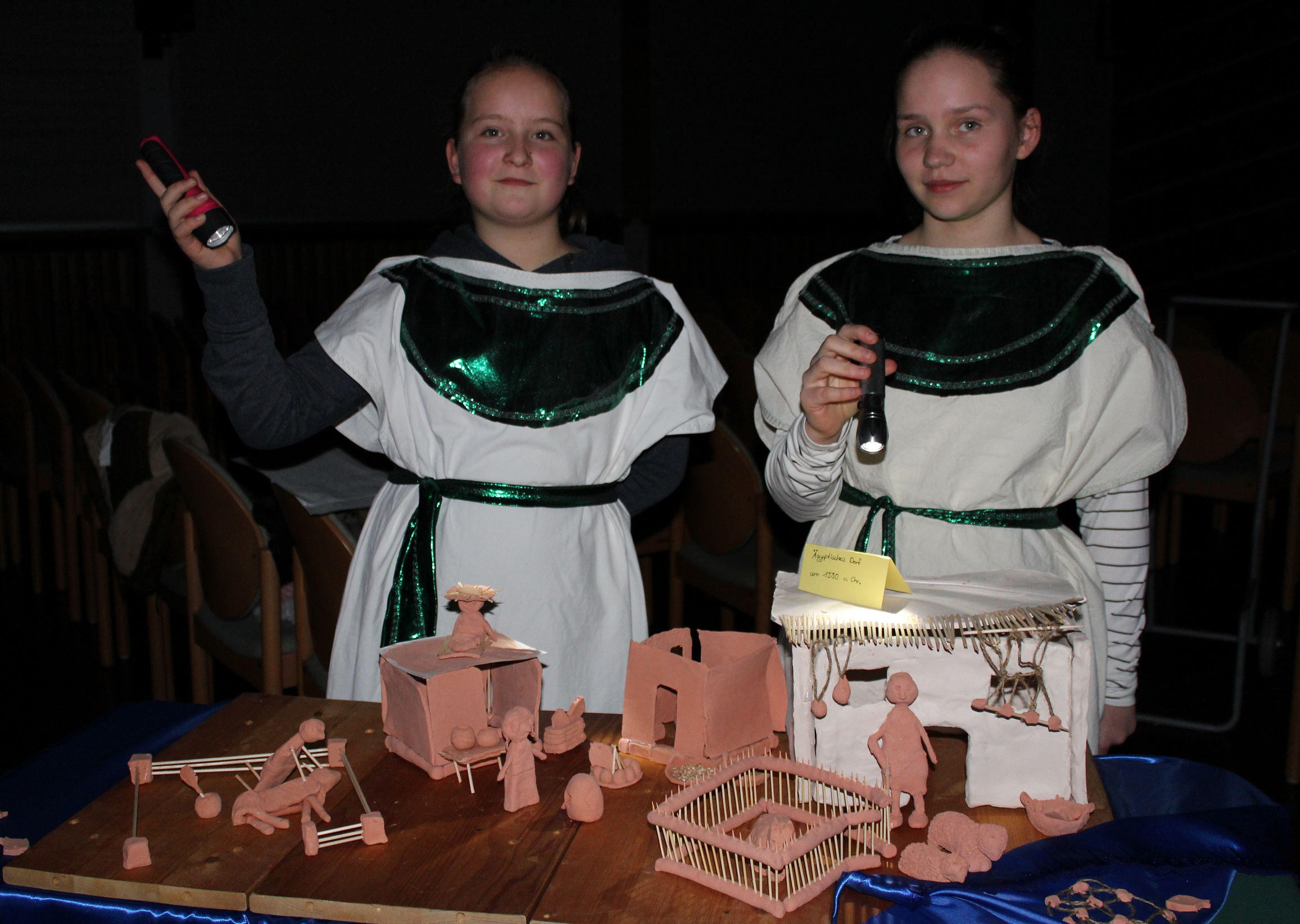 Die ägyptisch anmutend gekleideten Schülerinnen und Schüler erklärten in interessanten Kurzvorträgen Bedeutung und Entstehung ihrer Exponate sehr fachkundig und standen den zahlreichen Besuchern für Fragen zur Verfügung.