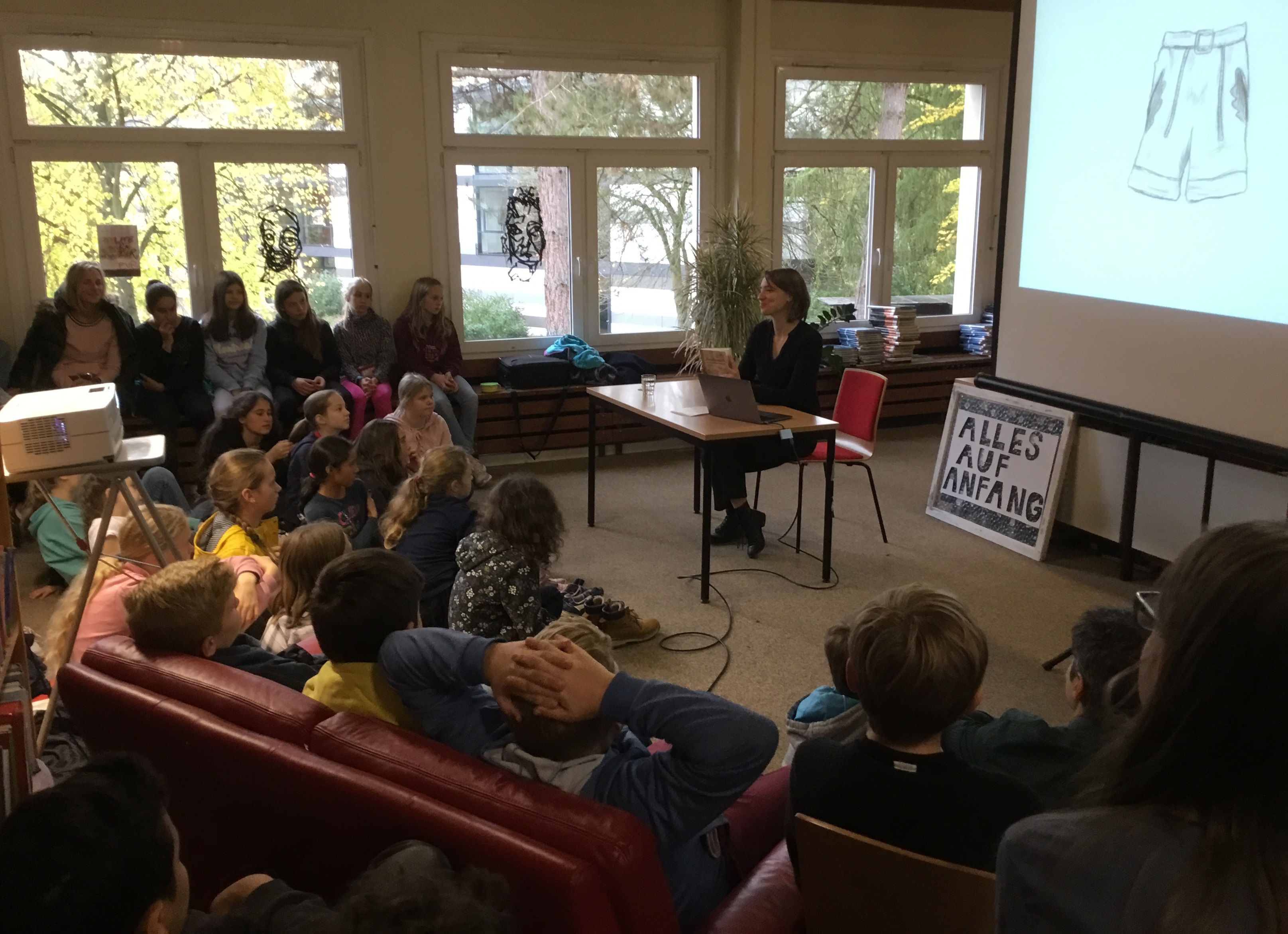 Die Klassen 5B, 6A, 6B und 6G kamen dann am Mittwoch in den Genuss einer Lesung von Anke Bär, die die Kinder von Beginn an mit ihrer authentischen und zugewandten Art in den Bann zog. Sie las den gespannten Schülerinnen und Schülern aus ihrem Roman „Kirschendiebe oder als der Krieg vorbei war“ vor, in dem sie die Geschichte von Lotte und ihrer Kindheit in der Nachkriegszeit erzählt. Fasziniert von diesem „anderen“ Leben lauschten die Kinder den Erzählungen Anke Bärs aus dieser Zeit: „Erstaunlich, wie die Menschen früher gelebt haben und was sie für Tricks hatten“ sagte Ksenia aus der 6B nach der Lesung und ihre Mitschülerin pflichtet ihr bei: „Wir wurden in ein anderes Leben entführt“. Mehr kann man von einer spannenden Lesung wohl nicht erwarten.