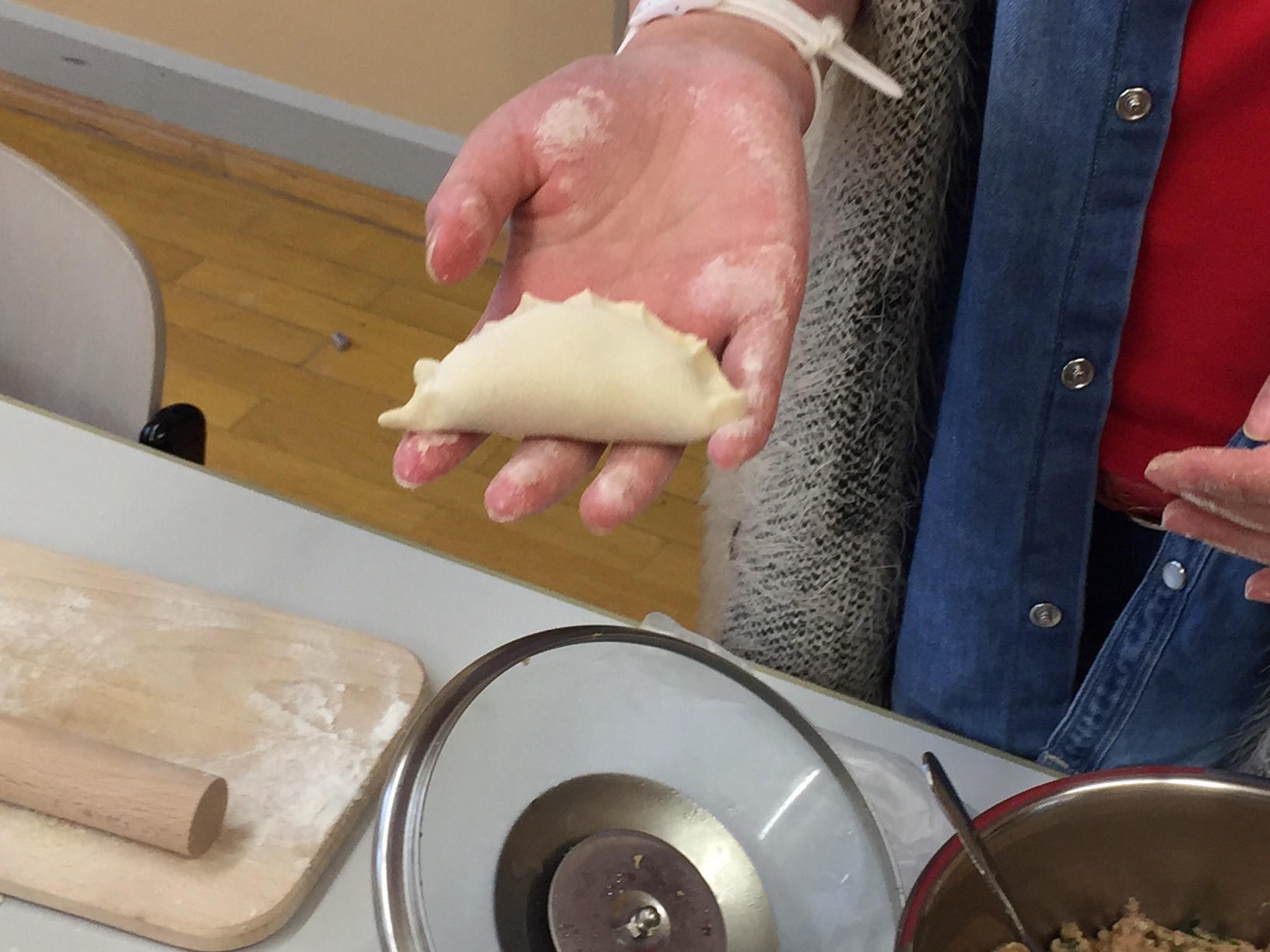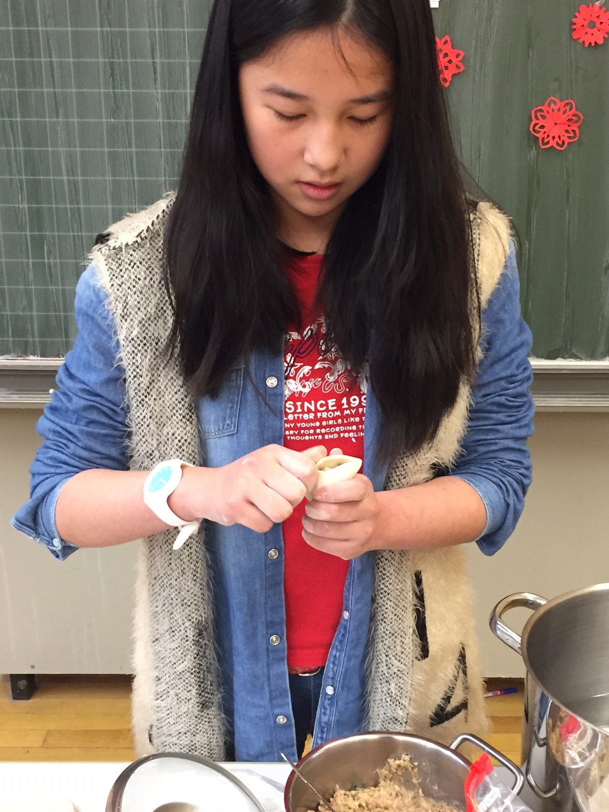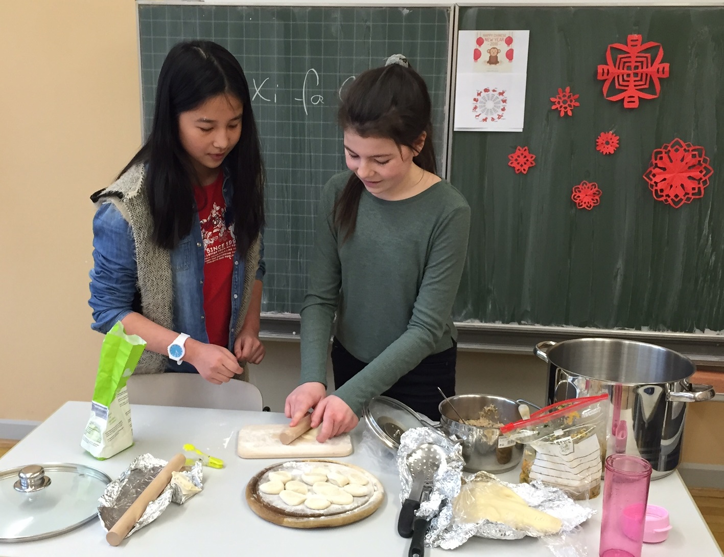Am Montag, dem 8. Februar, feiert man in China den Beginn des Neuen Jahres, es ist das “Jahr des Affen”. Aus diesem Anlass hat sich die Klasse von Frau Leroux etwas ganz Besonderes überlegt: Genau wie wohl in den meisten chinesischen Familien bereitet die 7BIL ein typisches chinesisches Gericht zu, Jiao Zi, gefüllte Teigtaschen. Es gibt sie vegetarisch und auch mit Fleischfüllung. Natürlich ist es für die ungeübten Kinderhände nicht so einfach, eine wirklich schöne (!) Teigform hinzubekommen, aber sie haben professionelle Anleitung von ihrer chinesischen Klassenkameradin Zhi Xing, die geschickt und mit Hilfe eines speziellen grifflosen Nudelholzes Hilfestellung gibt.
