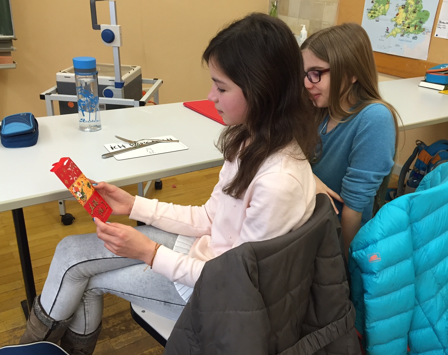 Während sich die Mutigsten an ihrer ersten Jiao Zi versuchen, erzählt Frau Leroux von den Hong Bao, kleinen roten Umschlägen, die in China an diesem Tag auch gefüllt werden, allerdings mit Geldscheinen und nur für die Kinder! Aber kein Kind wird vier Geldscheine in seinem Umschlag finden, denn das ist eine Zahl, die Unglück bringt. Und die 7BIL erfährt noch viel mehr über die Neujahrsbräuche der Chinesen, z.B., dass man Fenster und Türen geöffnet lässt, damit das Glück Einzug halten kann oder dass man Süßes isst, um das neue Jahr zu (ver-)süßen. Da der erste Tag des neuen Jahres auch ein Omen für die kommende Zeit bedeutet, sollte man den Tag gesellig verbringen, spielen, schöne Dinge tun. Dazu muss man ja glücklicherweise nicht bis nach China fahren …