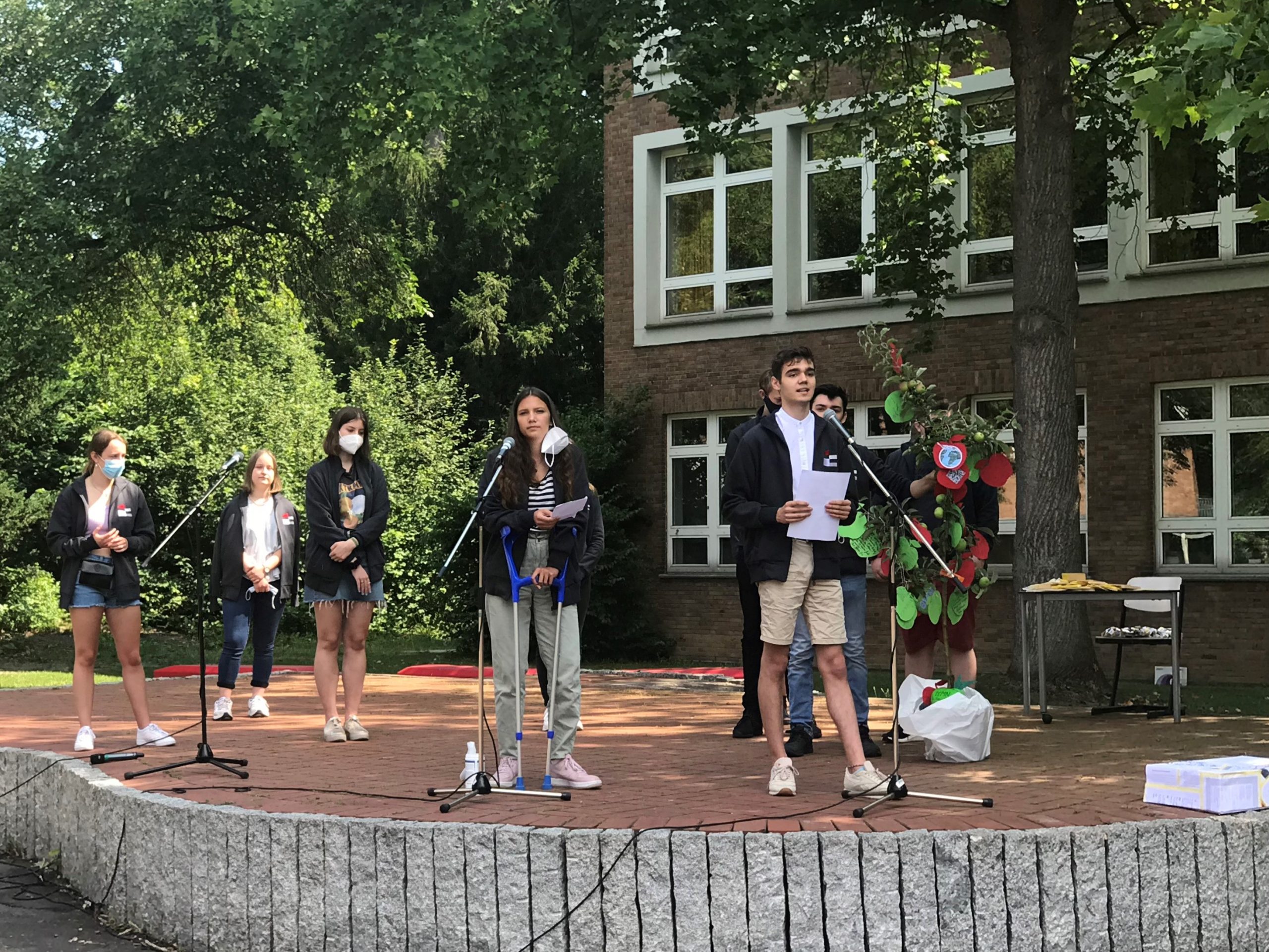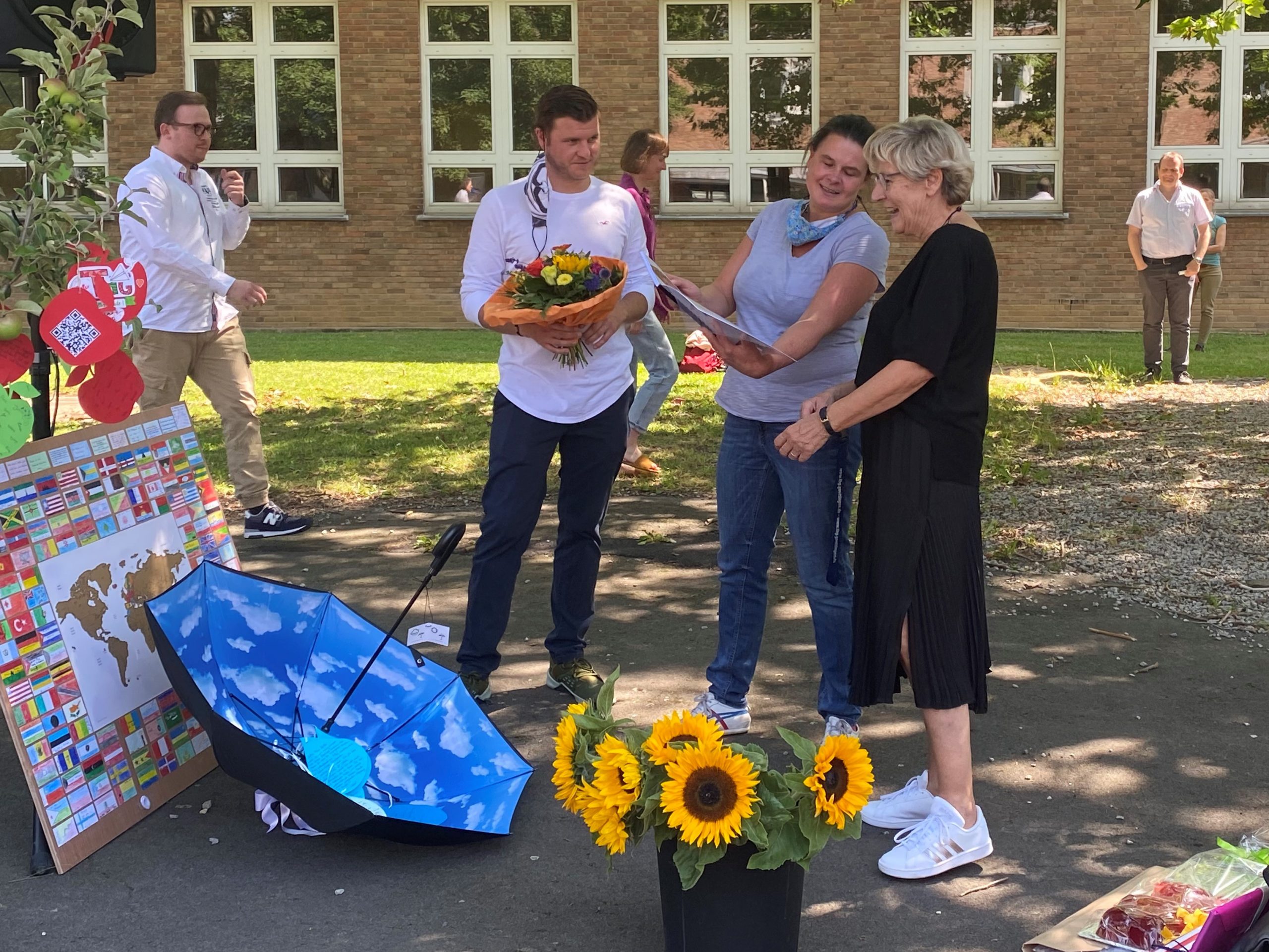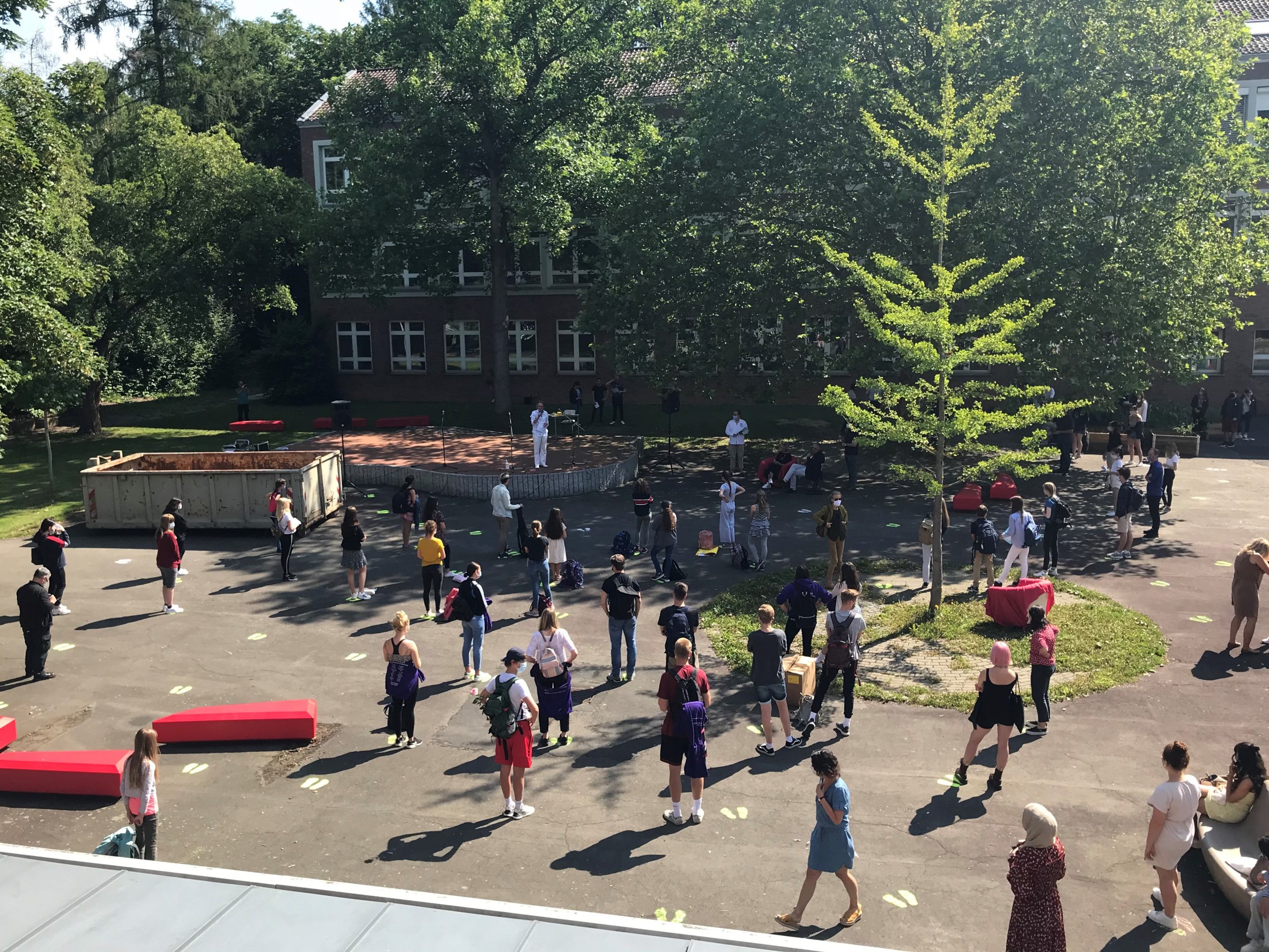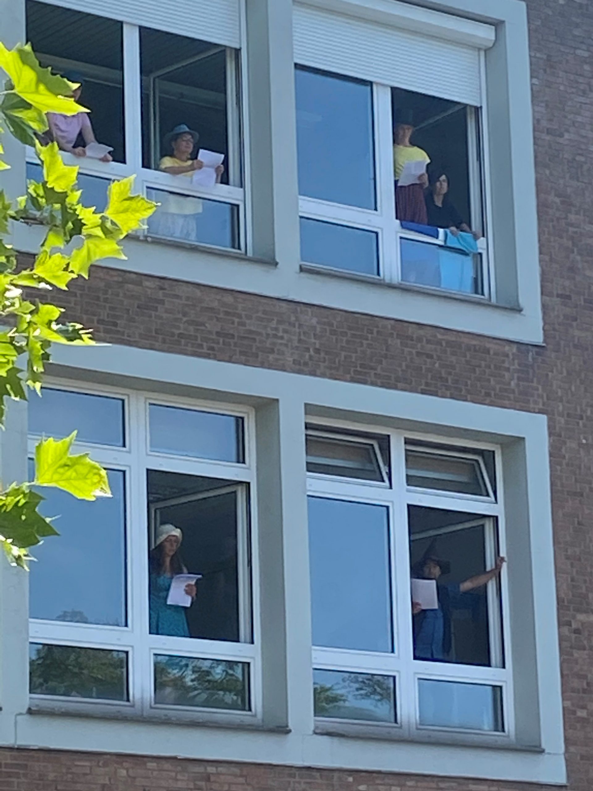 Sportlich salopp ausgedrückt war das die gelungene Pflicht und danach kam die rundherum geglückte Kür – die Verabschiedung durch die Schulgemeinde am Dienstag, dem 14. Juli, bei strahlendem Sonnenschein auf dem „coronasicheren“ Schulhof des THG. Aufgesprühte Fußstapfen in Sicherheitsabstand zeigten den Zuschauer*innen ihre Plätze und Frau Koller durfte im roten „Thronsessel“ Platz nehmen, wo sie einen guten Blick auf die Bühne hatte und von zwei jungen Kollegen und ihrem leidenschaftlichen Einsatz am Palmwedel aus dem Theaterfundus mit Frischluft versorgt wurde. Und dann ging es los, eine bunte Folge von Präsentationen der Fachbereiche, von Gremienvertreter*innen oder Einzelnen, die die Gelegenheit nutzen wollten, noch einmal ganz persönlich „Adieu“ zu sagen bis zu Vertreter*innen einzelner Klassen, die kistenweise Post zu Lektüre in Pensionszeiten übergaben. Moderiert wurde das Ganze von Claus Schlegel, der nach langer DS-Zwangspause offensichtlich ganz froh war, wieder einmal auf der Bühne agieren zu können. Frau Koller durfte jedoch nicht nur liebevoll gestaltete Geschenke von Schüler*innen und Kolleg*innen entgegennehmen, sie musste auch noch einmal zeigen, was sie draufhat: der eA-Kurs Deutsch fühlte der ehemaligen Deutschlehrerin mit seinem Zitatenquiz doch durchaus schmerzhaft auf den Zahn. Aber auch das meisterte sie und durfte sich dann umso mehr freuen über den Apfelbaum voller Zettel mit guten Wünschen, den Julian Giro im Namen der Schülervertretung überreichte. Und wo ein Baum ist, da muss auch eine Bank her. Kaum gedacht, so stolperten schon die Lehrerinnen Tina Heske und Jacqueline Ahrend mit ihrer grünen Bank über den Schulhof, die als Geschenk der Lehrerschaft der Ex-Schulleiterin für immer einen Platz auf dem THG-Gelände sichern soll. Tja, man könnte hier unendlich erzählen von den tollen großen und kleinen Geschenken, aber der Platz reicht leider nicht, sodass nur zwei Dinge noch erwähnt werden sollen. Zum einen die wunderbare virtuelle Sammlung aller Texte, Fotos, Filme etc. auf einem Padlet (Wir haben in Coronazeiten elektronisch nachgerüstet und gelernt!), deren Highlight ohne Frage der Teil „Pirat*innen im Schulleiterinnenzimmer“ ist, und der zeigt, was die Mäuse mit einem Schreibtisch machen, wenn die Katze aus dem Haus ist … Zum anderen der grandiose Abschluss der „Schulhof-Verabschiedung“ mit einem so leidenschaftlichen Fenstertheater, dass Frau Koller ganz am Ende ihrer Zeit am THG doch noch einmal beinahe das Blut in den Adern stockte, als die Kolleg*innen des FB Deutsch deklamierend die Simse erklommen!