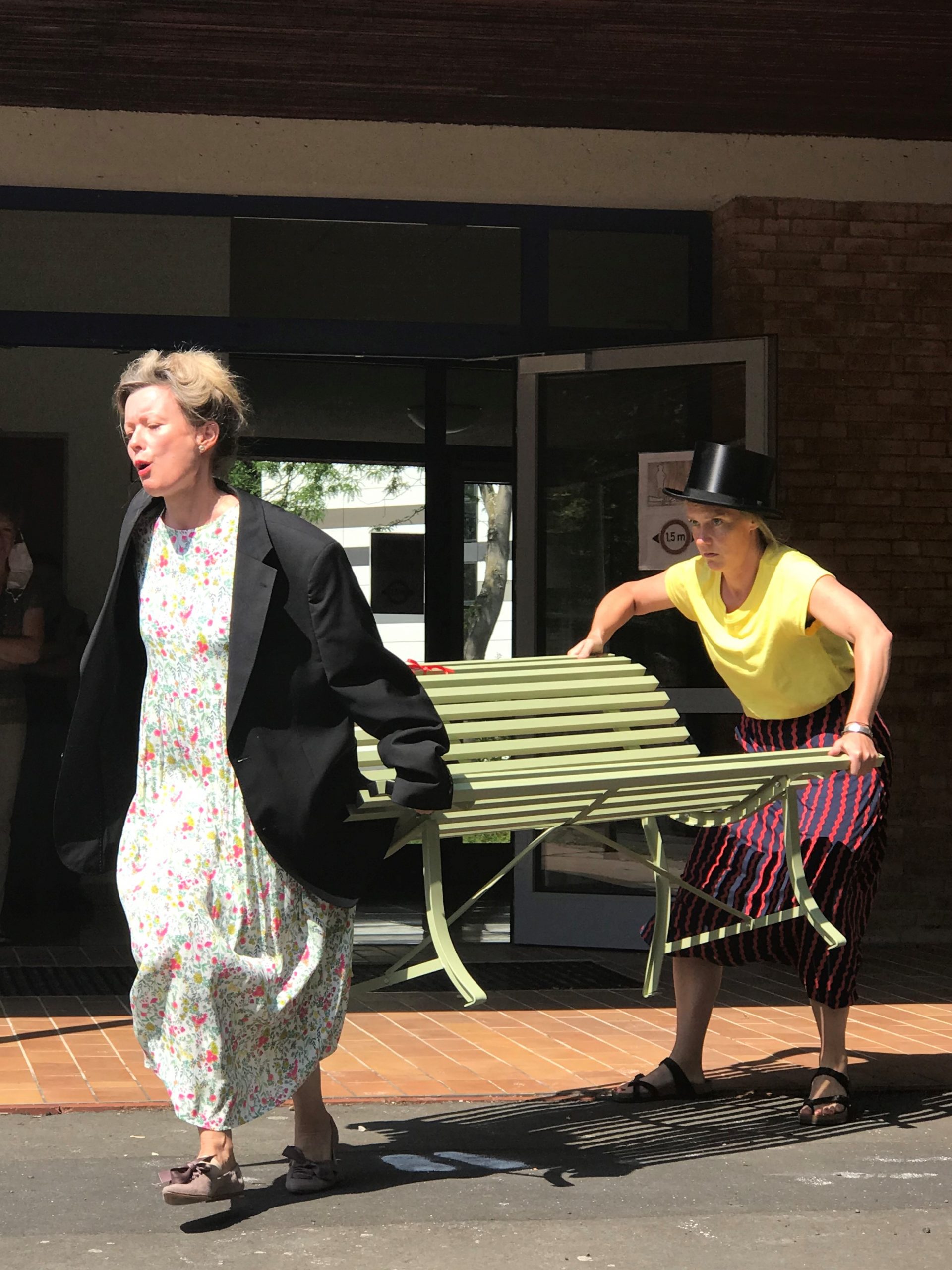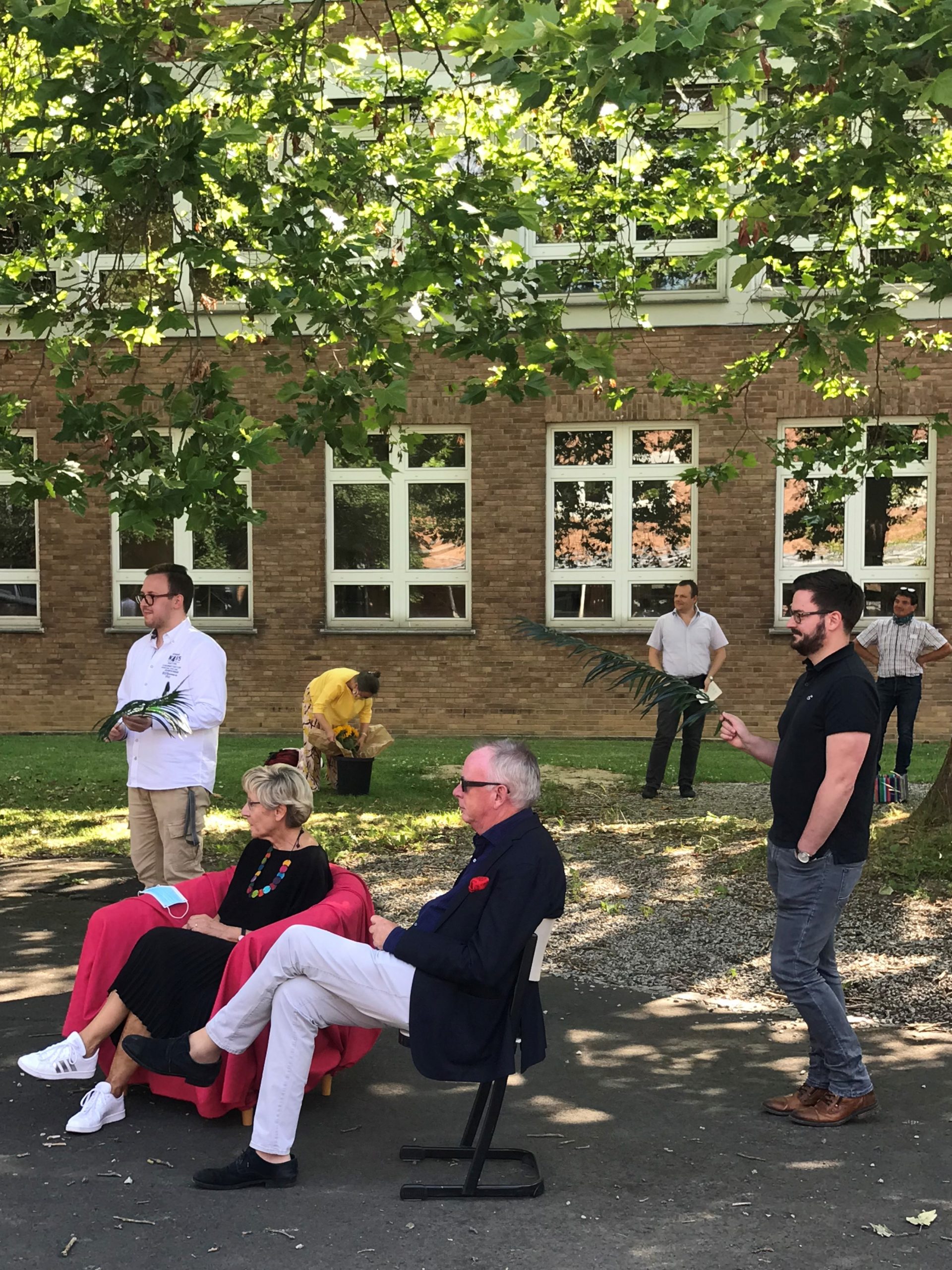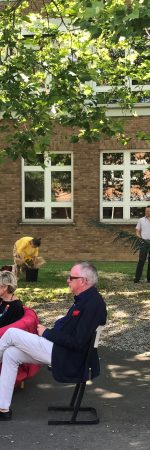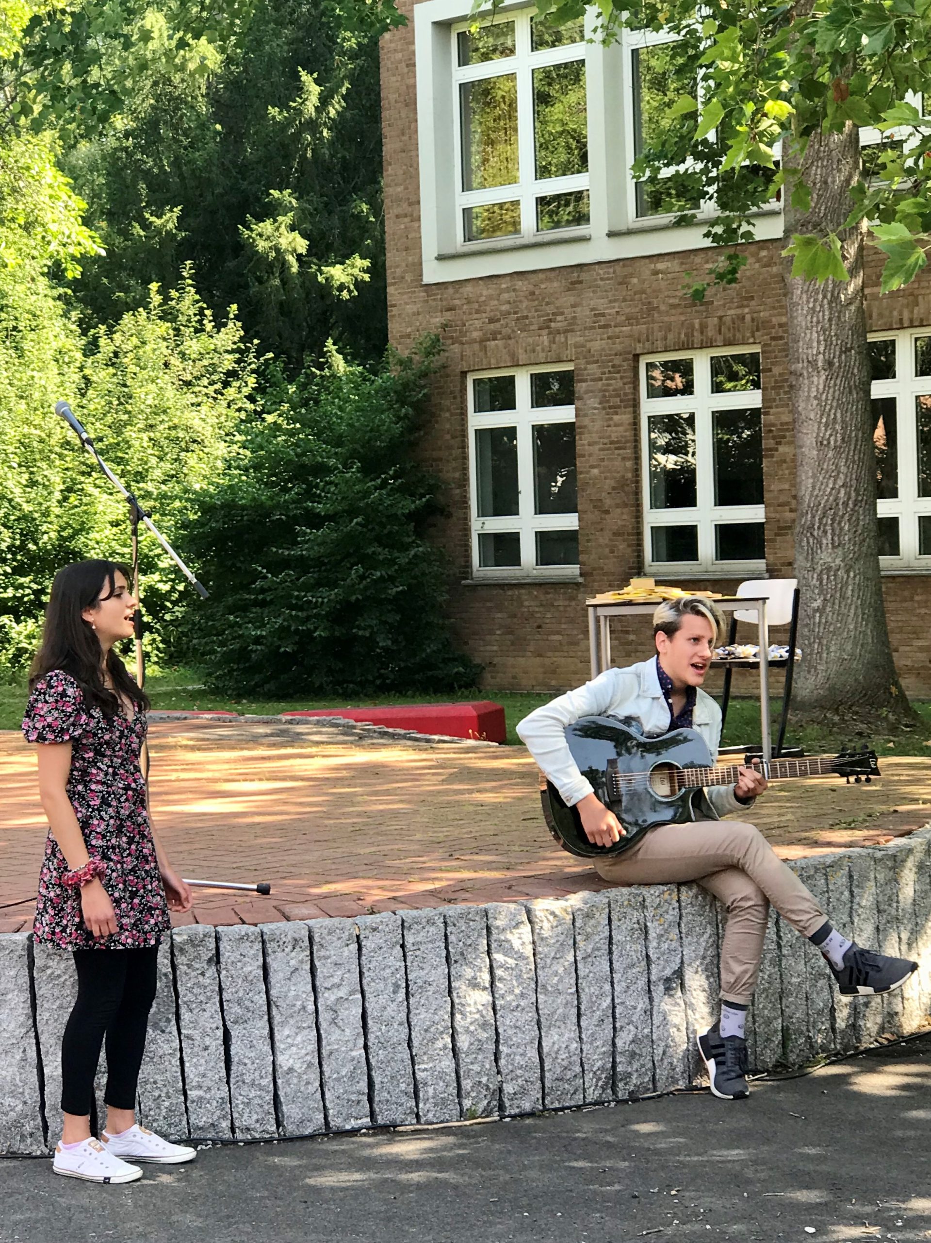 Sportlich salopp ausgedrückt war das die gelungene Pflicht und danach kam die rundherum geglückte Kür – die Verabschiedung durch die Schulgemeinde am Dienstag, dem 14. Juli, bei strahlendem Sonnenschein auf dem „coronasicheren“ Schulhof des THG. Aufgesprühte Fußstapfen in Sicherheitsabstand zeigten den Zuschauer*innen ihre Plätze und Frau Koller durfte im roten „Thronsessel“ Platz nehmen, wo sie einen guten Blick auf die Bühne hatte und von zwei jungen Kollegen und ihrem leidenschaftlichen Einsatz am Palmwedel aus dem Theaterfundus mit Frischluft versorgt wurde. Und dann ging es los, eine bunte Folge von Präsentationen der Fachbereiche, von Gremienvertreter*innen oder Einzelnen, die die Gelegenheit nutzen wollten, noch einmal ganz persönlich „Adieu“ zu sagen bis zu Vertreter*innen einzelner Klassen, die kistenweise Post zu Lektüre in Pensionszeiten übergaben. Moderiert wurde das Ganze von Claus Schlegel, der nach langer DS-Zwangspause offensichtlich ganz froh war, wieder einmal auf der Bühne agieren zu können. Frau Koller durfte jedoch nicht nur liebevoll gestaltete Geschenke von Schüler*innen und Kolleg*innen entgegennehmen, sie musste auch noch einmal zeigen, was sie draufhat: der eA-Kurs Deutsch fühlte der ehemaligen Deutschlehrerin mit seinem Zitatenquiz doch durchaus schmerzhaft auf den Zahn. Aber auch das meisterte sie und durfte sich dann umso mehr freuen über den Apfelbaum voller Zettel mit guten Wünschen, den Julian Giro im Namen der Schülervertretung überreichte. Und wo ein Baum ist, da muss auch eine Bank her. Kaum gedacht, so stolperten schon die Lehrerinnen Tina Heske und Jacqueline Ahrend mit ihrer grünen Bank über den Schulhof, die als Geschenk der Lehrerschaft der Ex-Schulleiterin für immer einen Platz auf dem THG-Gelände sichern soll. Tja, man könnte hier unendlich erzählen von den tollen großen und kleinen Geschenken, aber der Platz reicht leider nicht, sodass nur zwei Dinge noch erwähnt werden sollen. Zum einen die wunderbare virtuelle Sammlung aller Texte, Fotos, Filme etc. auf einem Padlet (Wir haben in Coronazeiten elektronisch nachgerüstet und gelernt!), deren Highlight ohne Frage der Teil „Pirat*innen im Schulleiterinnenzimmer“ ist, und der zeigt, was die Mäuse mit einem Schreibtisch machen, wenn die Katze aus dem Haus ist … Zum anderen der grandiose Abschluss der „Schulhof-Verabschiedung“ mit einem so leidenschaftlichen Fenstertheater, dass Frau Koller ganz am Ende ihrer Zeit am THG doch noch einmal beinahe das Blut in den Adern stockte, als die Kolleg*innen des FB Deutsch deklamierend die Simse erklommen!