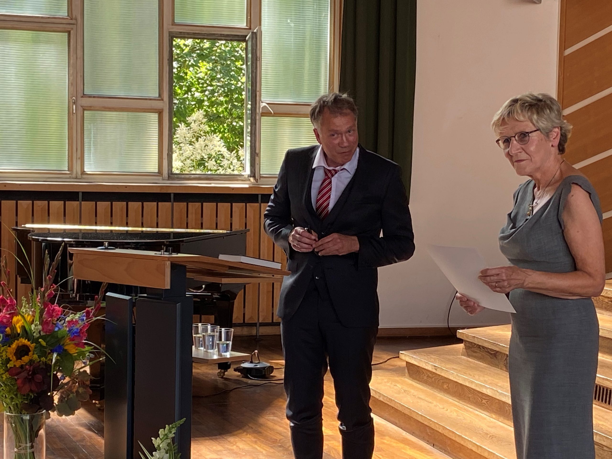 Nach 21 Jahren als Schulleiterin des Theodor-Heuss-Gymnasiums verlässt Frau Dr. Koller unsere Schule, um Ende Juli eine neue Phase ihres Lebens zu beginnen: die Zeit als Pensionärin. Eine für die gesamte Schulgemeinschaft noch etwas merkwürdige Vorstellung, war doch Frau Koller mehr als zwei Jahrzehnte die nimmermüde, engagierte und so kenntnisreiche „Chefin“ im Haus, scheinbar an jeder Stelle zugleich. Doch bevor sie sich ans Ausräumen ihres Büros machen konnte, standen noch einige Veranstaltungen auf der Agenda, die am Ende einer langen Berufskarriere unvermeidlich, aber auch wichtig und schön sind: die Verabschiedungen. Der erste, offizielle, Teil fand am Montag, dem 13. Juli 2020, in der Aula des THG statt. Coronabedingt verlor sich der kleine Kreis der Teilnehmenden im beeindruckend großen Saal, die Atmosphäre war dennoch feierlich und herzlich. Ehe Frau Koller aus den Händen des Dezernenten Dr. Eckhoff ihre Entlassungsurkunde entgegennehmen konnte, wurden ihre Person und ihre Arbeit umfassend gewürdigt. Neben dem stellvertretenden Schulleiter Mathias Behn, sprach Dr. Häntsch als Vertreter der Stadt Göttingen, MPG-Schulleiter Dr. Schimpf für die Göttinger Gymnasialdirektor*innen, Frau Leffers für den Förderverein und Herr Kierbaum war als Repräsentant des Schulelternrates in der Runde der Laudator*innen. Eingerahmt wurden die vielen lobenden Worte durch einen Auftritt des Musik-Praxiskurses 12, der Ausschnitte aus Händels Wassermusik präsentierte und einem Quintett aus Musiklehrer*innen, die für ihre scheidende Schulleiterin das Menuett aus Mozarts Klarinettenkonzert spielten. Frau Koller war baff vor Freude, denn damit hatte sie nicht gerechnet nach der langen Zeit des durch die Pandemie erzwungenen „Musikverzichts“ in der Schule. Und damit nicht genug: Christian Neofotistos‘ Stimme setzte den musikalischen Schlusspunkt einer sehr feierlichen Verabschiedung bei der Frau Kollers Schlussworte alle Zuhörenden überzeugten, dass die Geehrte auch „danach“ ihre Zeit zu nutzen wissen wird.