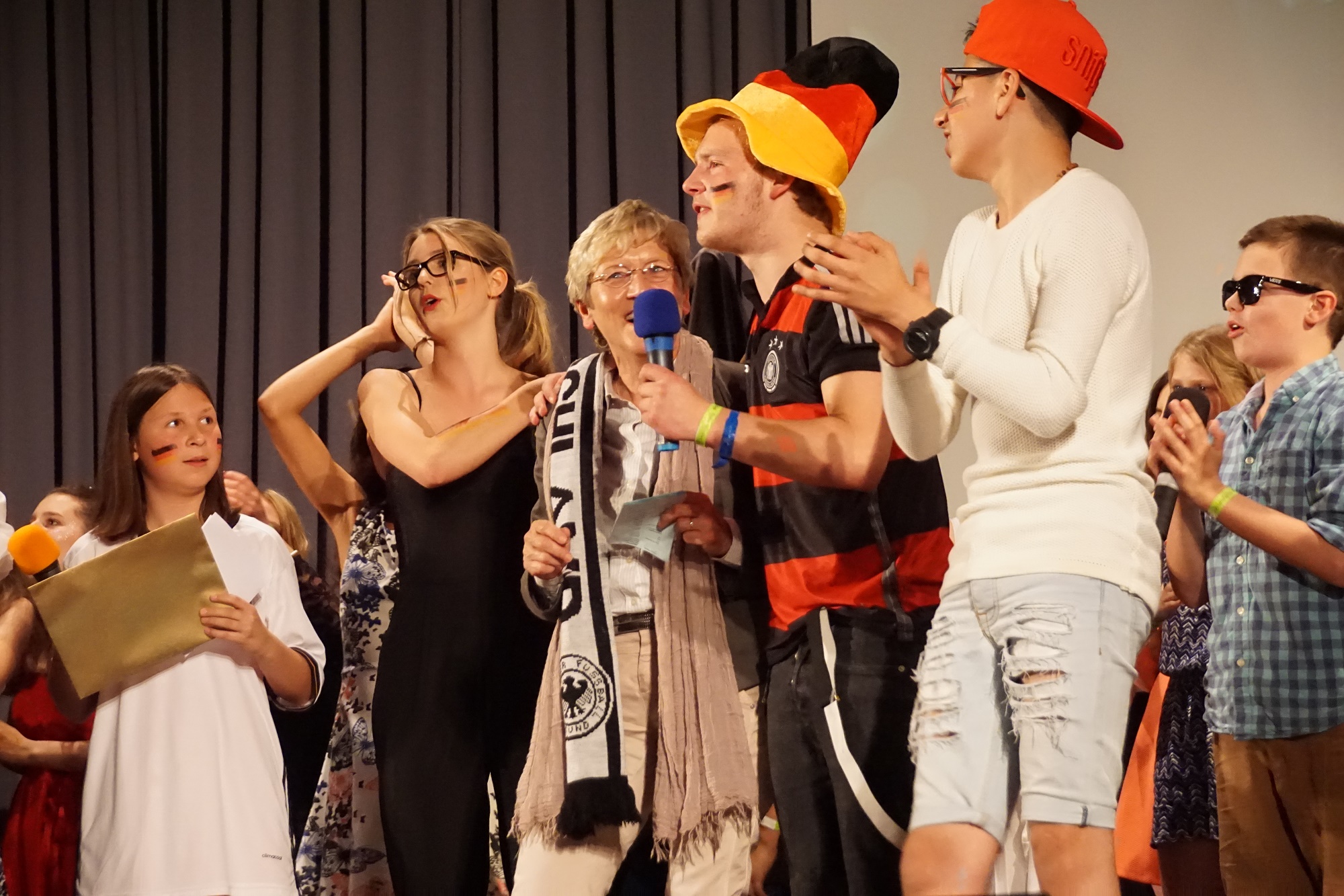 Der Theovision des Jahrgangs 1 war ein solcher Erfolg, dass im folgenden Jahr ein Casting durchgeführt werden musste, denn mehr als zehn „acts“ verkraftet ein Team, das zwar aus leidenschaftlich Engagierten besteht und hochprofessionell arbeitet, aber dennoch nicht. Apropos, die gesamte Technik lag von Anfang an in Schülerhand, angeleitet von unserem Schulassistenten Frank Scheidemann, der zu diesem Zweck eigens eine Technik-AG gründete. So wie die Technik werden auch alle anderen Aufgaben von Kulisse und Schminke bis zum Einlassdienst von Schülerinnen und Schülern übernommen, die gemeinsam mit dem Filmteam, das die einzelnen Ländervideos dreht, in diesem Jahr bereits eine Mannschaft von mehr als 50 Personen umfasste. Die Chefinnen des Managements sind – gemeinsam mit Noah Lokocz auf Schülerseite – von Beginn an Frau Neumeyer, Frau Müthing, Frau Köbernick, Frau Jumah und Frau Heske, die den Theovision vor allem als eine Chance für die Beteiligten sehen, einmal das ganze Spektrum ihrer Fähigkeiten zu zeigen, die den Auftretenden genau zuhören und versuchen, ihre Wünsche zu erfüllen. Aus diesem Grund ist der Theovision, sagt Frau Neumeyer, vor allem „eine Veranstaltung des Herzens“.
