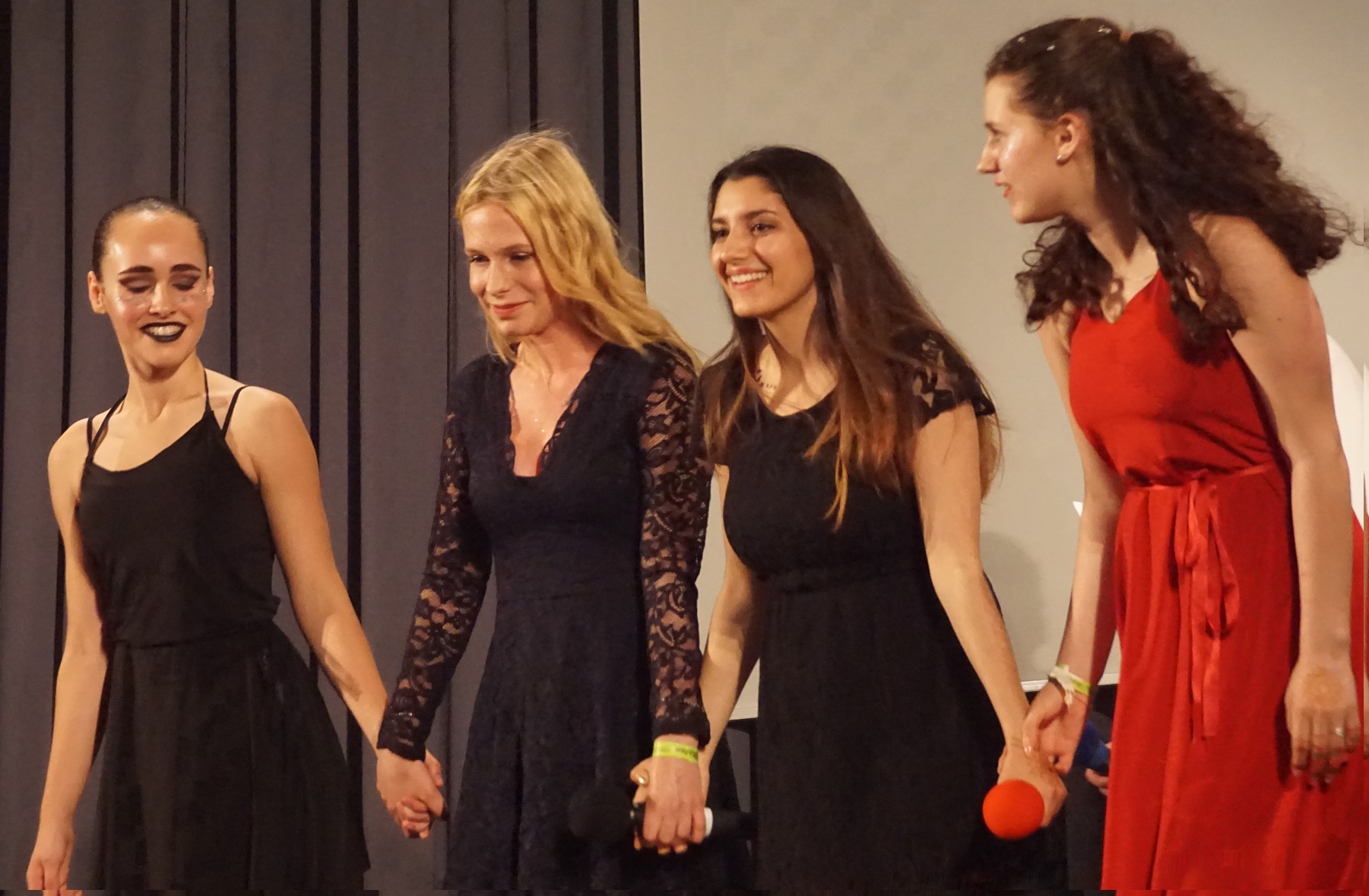 Natürlich waren auch die Karten der Ausgabe 2016 wieder heißbegehrt, an den Eingangstüren drängelten sich die Fans, um die 40 Künstlerinnen und Künstler der Jahrgänge 6 bis Q2 zu bewundern und zu beklatschen, die u.a. Songs von Louane und Coldplay interpretierten. Ein besonderer Moment war der Auftritt unseres syrischen Schülers Abdullah, der a capella ein arabisches Liebeslied interpretierte und dem die Herzen des Publikums zuflogen. Noch ein klein wenig Herzen mehr flogen allerdings Edina Abdullah und Anna-Lena Schilling (Q1) zu, die mit ihrer Interpretation von „Jar of Hearts“- begleitet von den Tänzerinnen Alina Cernov und Leonie Seidel – den Theovision für sich entscheiden konnten.