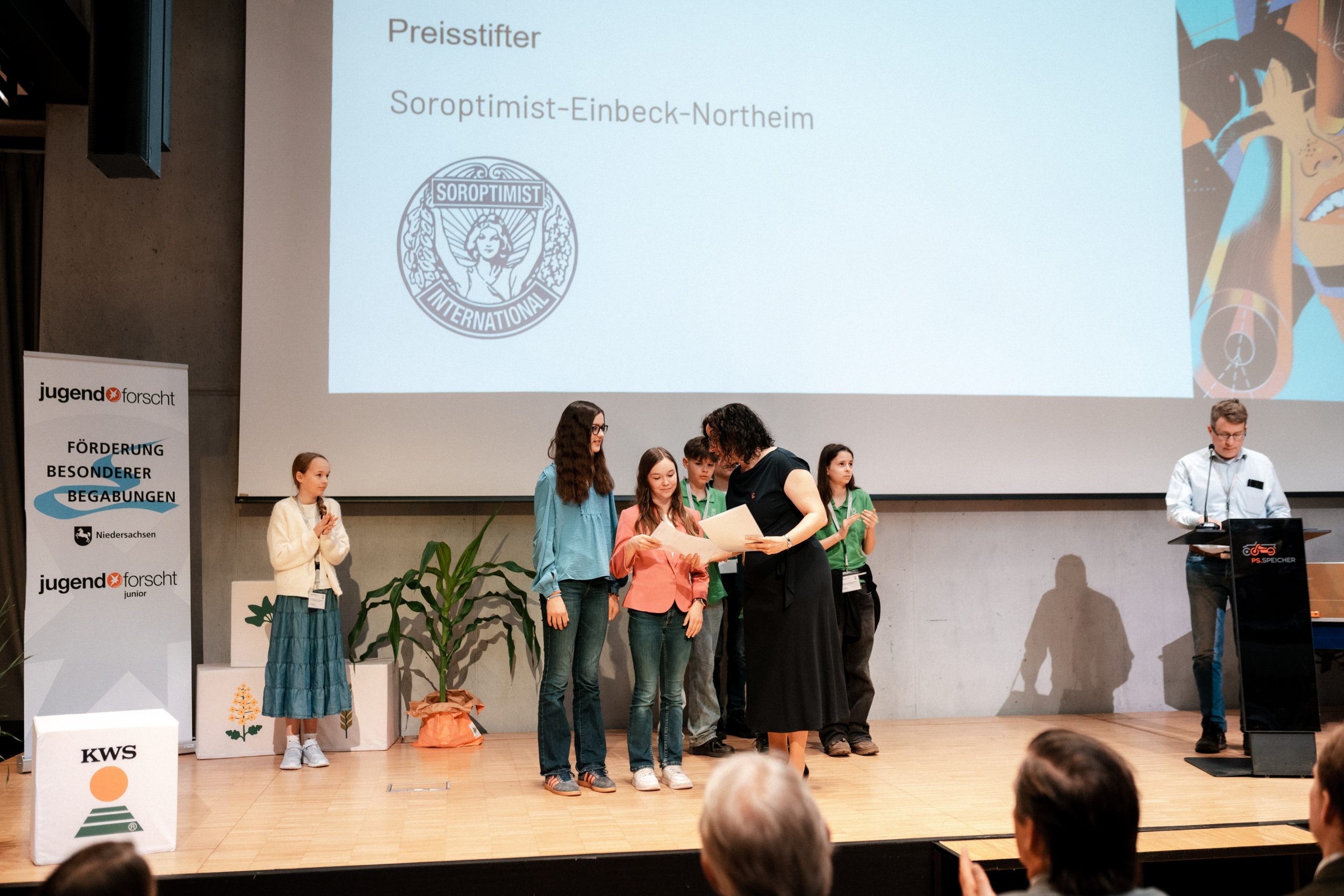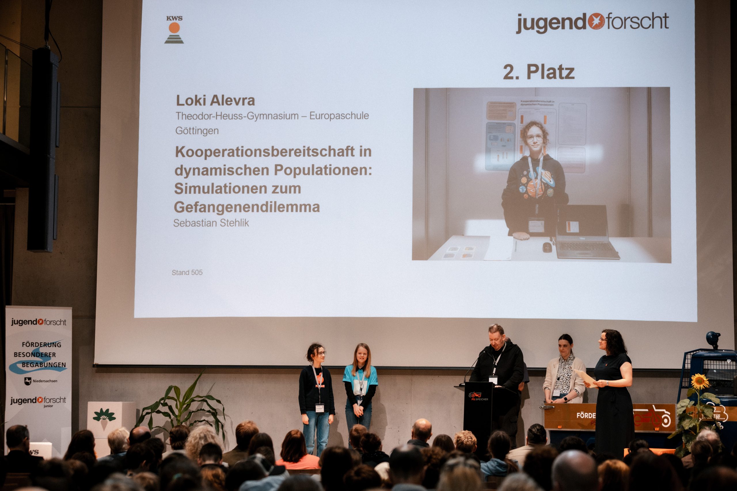 Loki erreichte in Einbeck mit ihrem Projekt „Kooperationsbereitschaft in dynamischen Populationen: Simulationen zum Gefangenendilemma“ den 2. Platz Mathematik/Informatik in der Sparte „Jugend forscht junior“, Annunciata und Emma errangen mit ihrem Projekt „Alltägliche Konservierungsmittel und ihre Wirkung auf die Haltbarkeit von Lebensmitteln“ einen Sonderpreis des Vereins Soroptimist-Einbeck-Northeim. Herzlichen Glückwunsch!