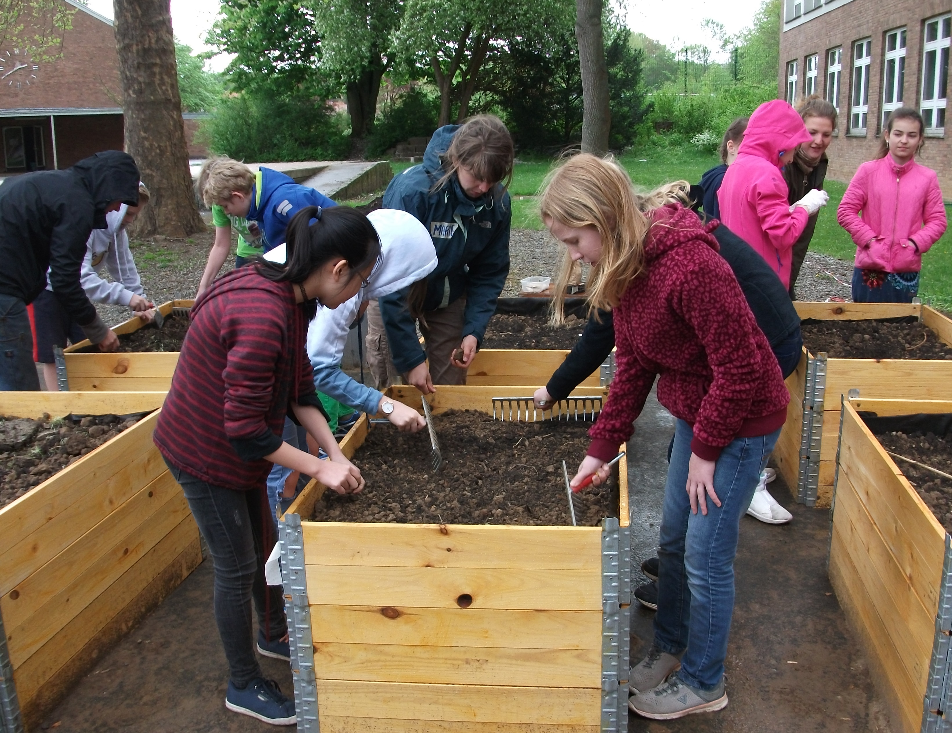 Seit einigen Tagen stehen auf unserem Schulhof zehn Hochbeete in der Frühlingssonne, die alle vier Klassen des Jahrgangs 6 – gemeinsam mit ihren Lehrerinnen Frau Bender, Frau Meyfahrt und Frau Sowinski – aufgebaut, gestrichen und mit Erde befüllt haben. Dabei war professionelles Arbeiten gefragt: Vlies wurde angetackert, Strauchabschnitte eingefüllt und vieles mehr.
