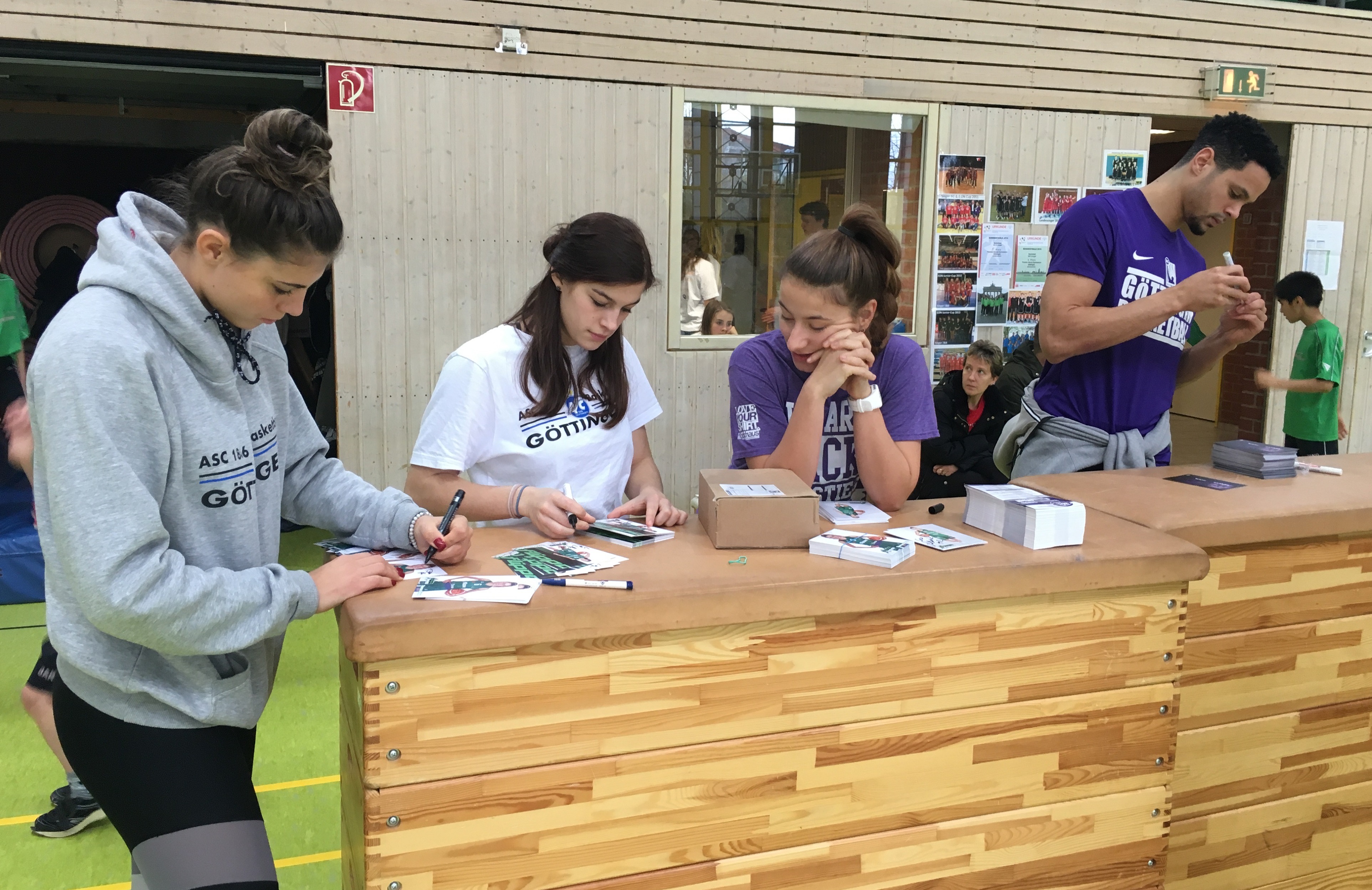 Basketballer der aktuellen Bundesliga – Teams gaben Autogramme und mit dabei waren auch ehemalige THG-Schülerinnen und Schüler, die viele Jahre erfolgreich für das THG Basketball gespielt haben.
