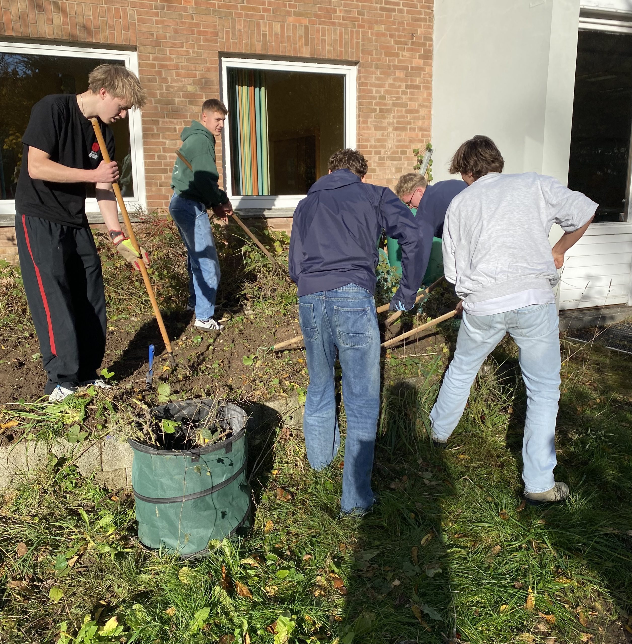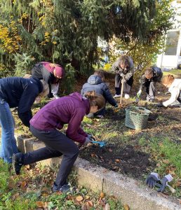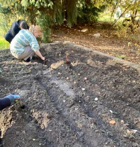 Der WN-Kurs von Frau Ahrend war sofort bereit, Geburtshilfe zu leisten, hat die vorgesehenen Hochbeete von Unkraut befreit, umgegraben und so vorbereitet, dass im Anschluss über 200 Tulpenzwiebeln gesetzt werden konnten! Als alles ordnungsgemäß eingegraben war, haben die Gärtner:innen beide Beete schließlich mit schützendem Herbstlaub abgedeckt, sodass aus den vielen Zwiebeln im kommenden Frühjahr hoffentlich ebenso viele schöne Tulpen wachsen und am Verkaufsstand reichlich Spendengelder fließen lassen!