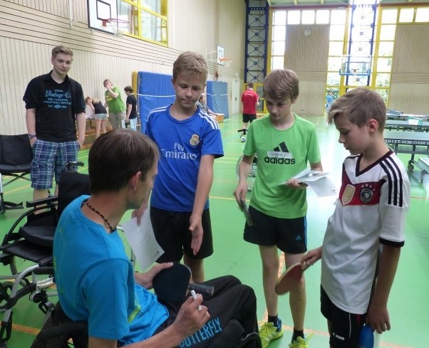 Es folgten dann erste Versuche unter der Anleitung von Holger Nikelis und Mathias Kleinert Tischtennis im Rollstuhl zu spielen. So wechselten die Schüler ihre Perspektive und konnten sich im Sitzen mit ihren Schulkameraden messen, und spielerisch erleben, wie es ist mit einem Rollstuhl zurecht zu kommen.
