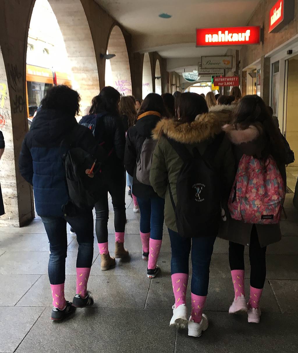 Alle Ausflüge waren vom grauen und kühlen Wetter begleitet, was die Laune der spanischen Schüler jedoch nicht trübte – für den Tagesausflug nach Erfurt kauften sie sich rosa Socken, auf die gelbe Bananen genäht waren, und zogen sie knöchelhoch über die Hosen. Auf die Frage, weshalb sie genau diese Socken als eine Art “Trikot” verwendeten, antworteten sie “”iPorque somos los plátanos!” – Weil wir die Bananen sind…