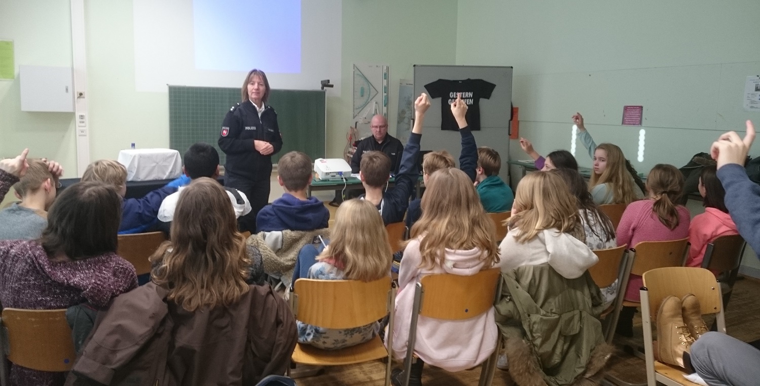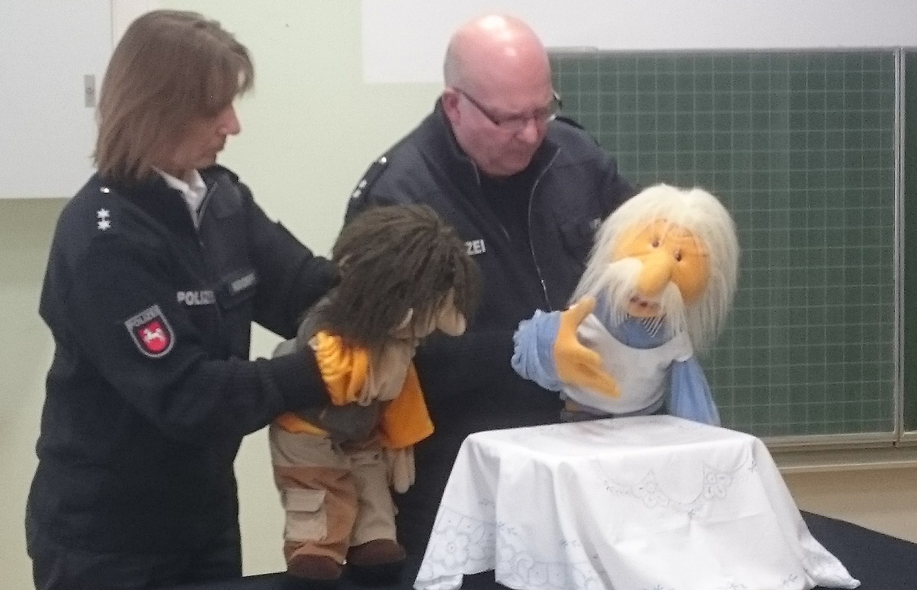 In aufmerksamer und angenehmer Atmosphäre haben die Polizisten Gudrun Nixdorff, Martin Napp und Petra Osburg mit tatkräftiger Unterstützung der beiden Puppen Kalle und Flori den Schülerinnen und Schülern des Jahrgangs 7 Hinweise gegeben, wie man sich vor den Gefahren und Versuchungen des Alkohols schützen kann und wie man sich in schwierigen Situationen richtig verhält. Dabei lieferte das Puppenspiel sehr gute Beispiele für verzwickte Lagen, mit denen man sich auch im “richtigen” Leben konfrontiert sehen kann, und sensibilisierte das junge Publikum durch zahlreiche gut gewählte Fakten, die in einer Powerpoint-Präsentation dargestellt wurden. Und natürlich war auch bei diesem Auftritt der Präventionspuppenbühne die interaktive Moderation ein entscheidender Pluspunkt, die Offenheit und Authentizität der Polizisten, ihr Verzicht auf Belehrendes und vor allem ihre Berichte von realen Vorkommnissen haben die Zuhörer gewiss zum Nachdenken gebracht.