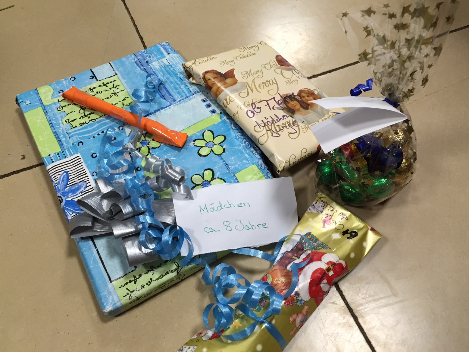 Die Tage vor Weihnachten sind traditionsgemäß die Zeit der Klassenweihnachtsfeiern und das Schönste dabei ist natürlich das Auspacken der kleinen Wichtelgeschenke. Was uns gefällt, das könnte doch den Flüchtlingskindern aus der THG-Nachbarschaft im ehemaligen IWF vielleicht auch gefallen? So haben es sich die 25 Schülerinnnen und Schüler aus der Klasse 6c gedacht und in diesem Jahr nicht nur ein Päckchen für ihre Klassenkameraden geschnürt, sondern noch ein zweites für die jüngsten Bewohner der neuen Flüchtlingsunterkunft am Nonnenstieg zusammengestellt. Damit auch das passende Geschenk den richtigen neuen Besitzer findet, hängt an jedem Präsent ein kleines Schildchen mit einem Hinweis auf das geeignete Alter und Geschlecht des Empfängers – eine weitere richtig gute Idee. Und dann haben die schenkfreudigen Sechstklässler auch noch einen Begleitbrief verfasst, in dem sie den Kindern, die zumeist aus einem ganz anderen Kulturkreis kommen, unseren Brauch des Beschenkens an Weihnachten kurz erklären.