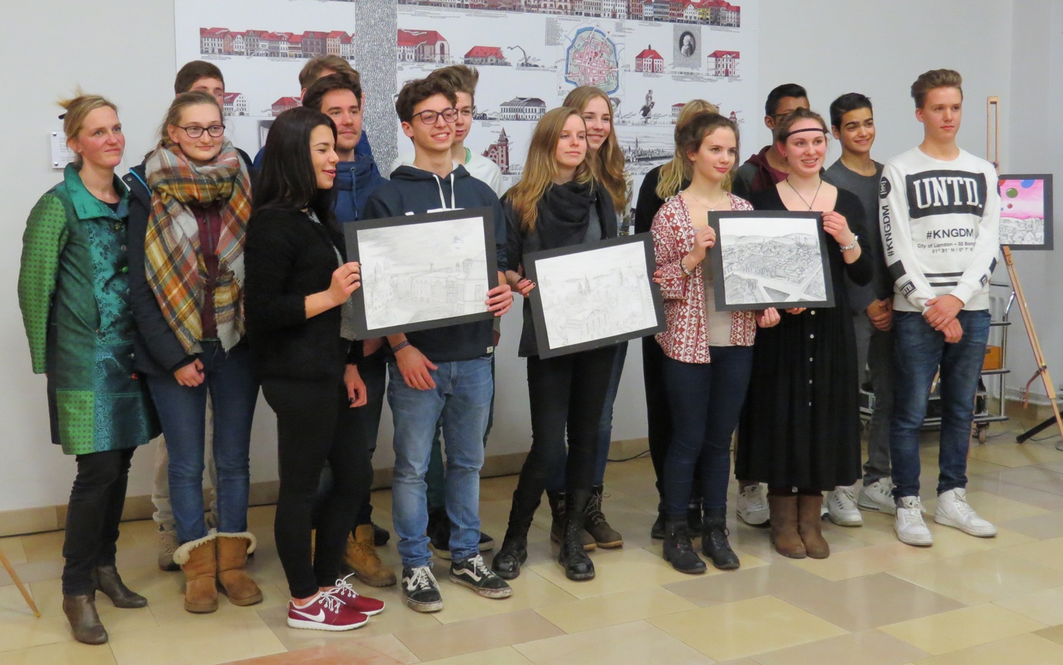 Seit Beginn des Schuljahres beschäftigte sich der Kunst-Leistungskurs des Jahrgangs Q1 mit dem Thema Vedutenmalerei und es ist vor allem der Begeisterung und dem Engagement ihrer Lehrerin Frau Heske zu verdanken, dass die Schülerinnen und Schüler diesem Thema mehr als nur pflichtgemäßes Interesse entgegenbrachten. So konnten sie von hoch oben, nämlich der letzten Etage des Neuen Rathauses auf Göttingen blicken, von dort ihre Stadt aus einer ganz neuen Perspektive entdecken – und zeichnen! So war es dann mehr als ein glücklicher Zufall, dass der aus Göttingen stammende Künstler Uwe Brandi seine “Göttinger Stadtansicht” den Gymnasien seiner ehemaligen Heimatstadt zum Geschenk machte und eine großartige, von der Litfin-Stiftung finanzierte, Reproduktion des Bildes in der Säulenhalle des THG einen würdigen Platz gefunden hat.