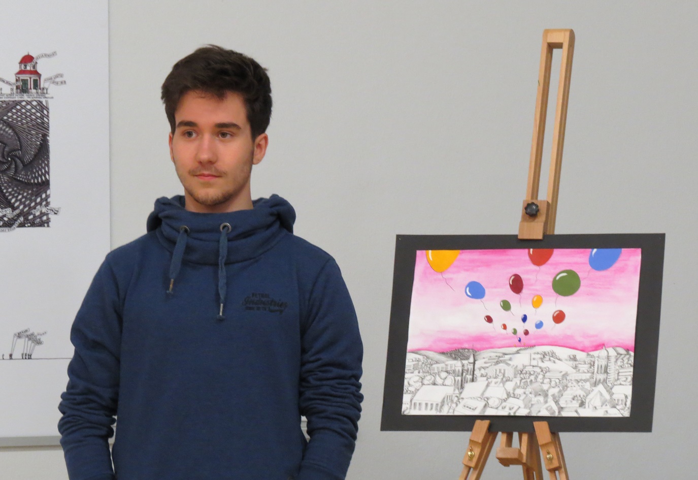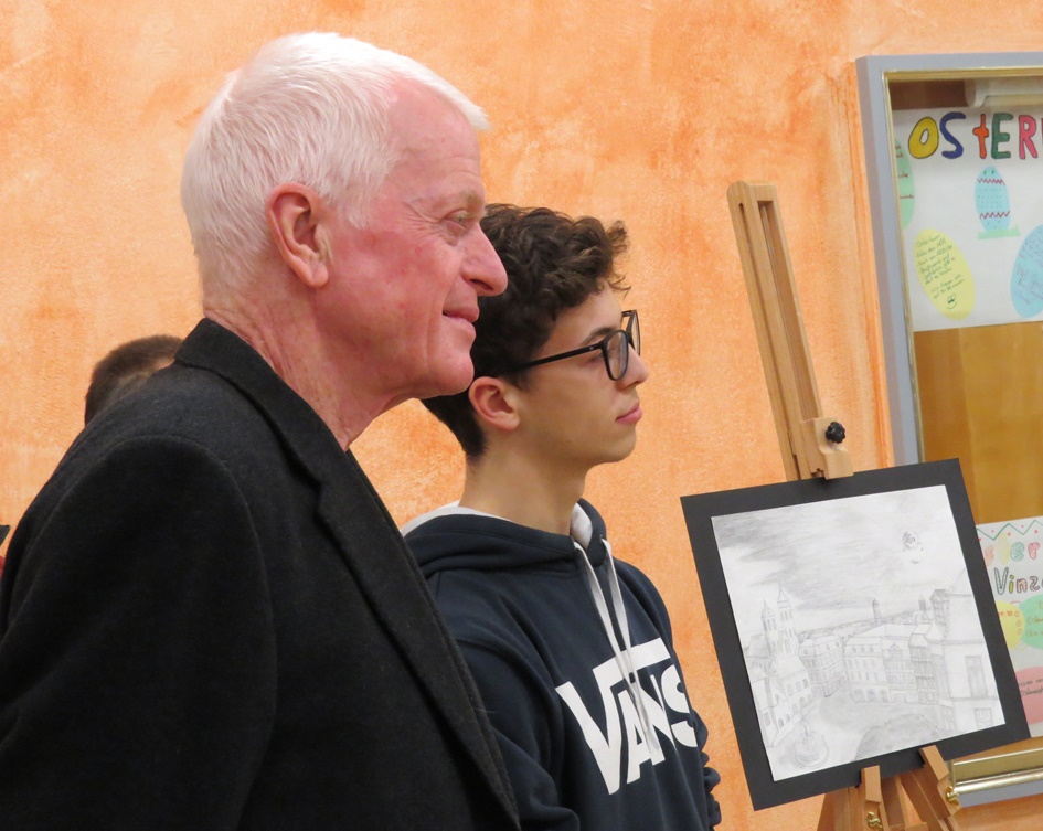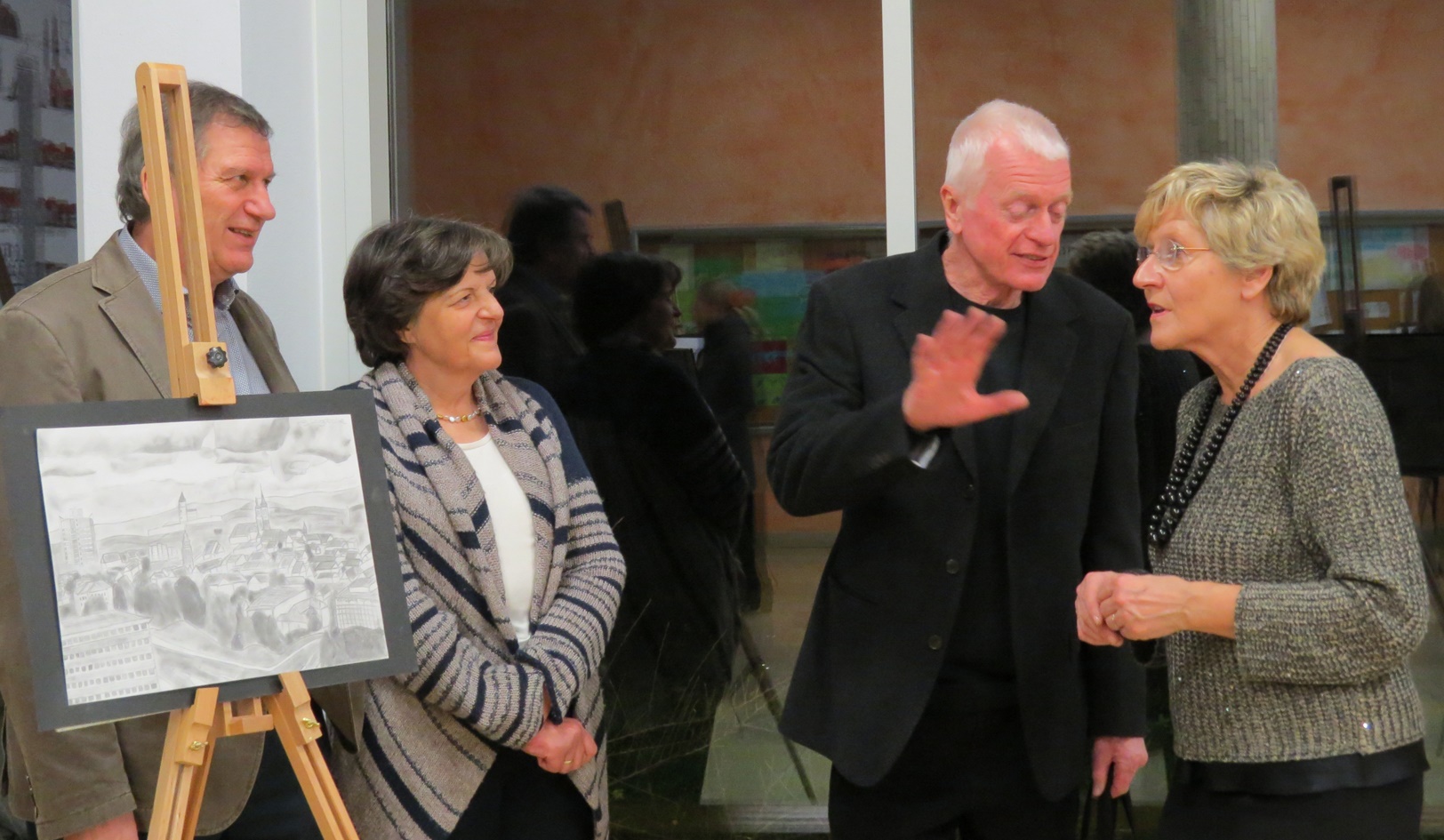 Zur offiziellen “Inbesitznahme” des Bildes am Dienstag, dem 12. Januar, hatte der Kunstkurs Uwe Brandi eingeladen und ihn sowie alle Interessierten zum Dialog mit eigenen Arbeiten gebeten. In Gegenwart des Künstlers, des Stifterehepaares Litfin und zahlreicher Gäste stellten die jungen Künstler ihre Bilder vor, präsentierten aber auch die Werke der “Kurs-Kollegen” mit kleinen selbst geschriebenen Texten. Im Anschluss gab es nicht nur Dialoge, sondern zahlreiche intensive Gespräche in kleineren und größeren Gruppen über die Geschichten, die Brandis Bild erzählt, aber auch über die vielen Facetten Göttingens die in den großartigen Zeichnungen der Schülerinnen und Schüler sichtbar gemacht wurden.