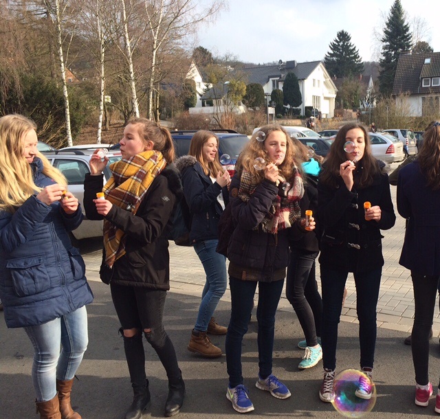 Zur Belohnung für erfolgreiches Sammeln gab es Seifenblasen gratis und die machen auch in der neunten Klasse noch eine Menge Vergnügen! Vielleicht sollten es im Angesicht unaufgeräumter Kinderzimmer verzweifelte Eltern auch einmal mit pinkfarbenen Müllsäcken und Seifenblasen als Motivationshilfe versuchen? Einen Versuch ist‘ gewiss wert.