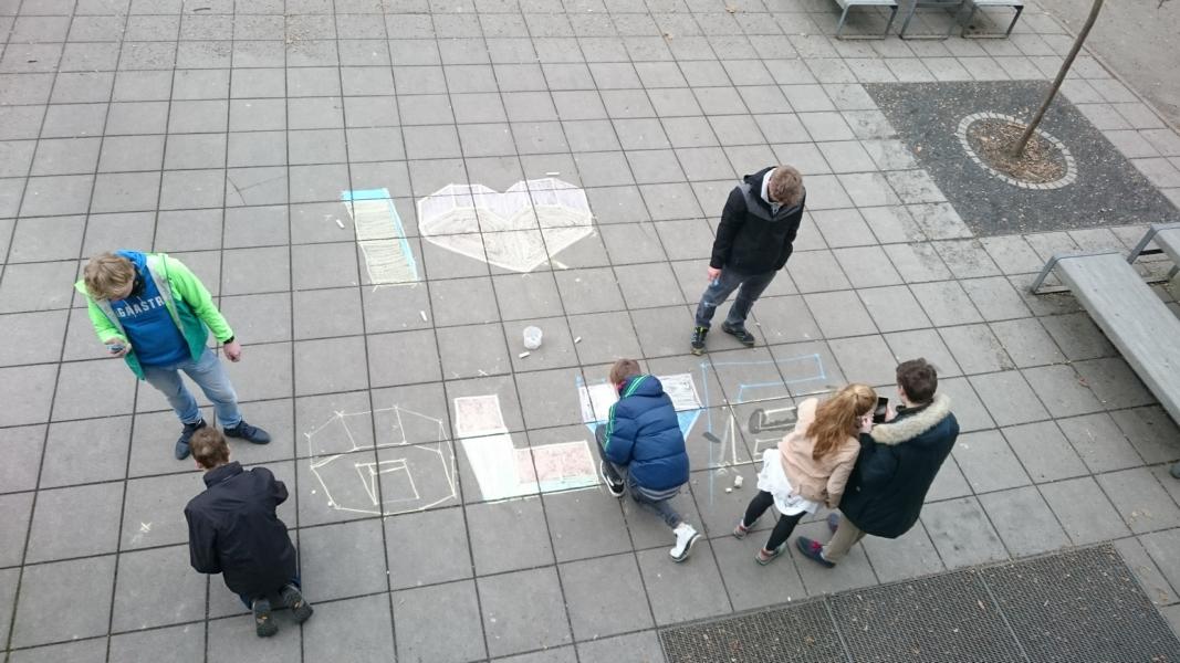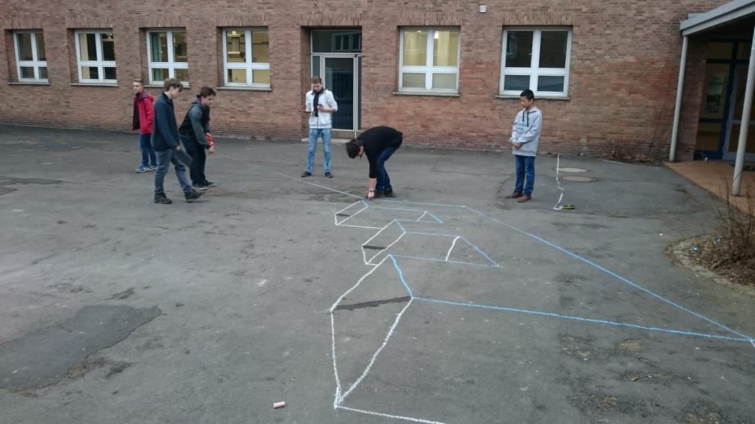 In Gruppen haben die Schülerinnen und Schüler Schriftzüge designt und Berechnungen durchgeführt, so dass die Kreidezeichnungen auf dem Schulhof aus einer bestimmten Perspektive – wie die Werbebanner am Fußballfeldrand – einen dreidimensionalen, stehenden Eindruck entstehen lassen.