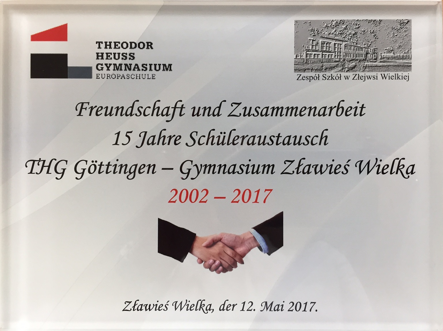 Vom 11.5.2017 bis zum 20.05.2017 verbringen sie ihre Zeit bei den Partnern des 7. Jahrgangs. In den 10 Tagen des Austauschs in Göttingen sind viele interessante Aktionen (Phäno, Autostadt, Goslar, THG Olympiade uva.), aber auch ein wenig Unterricht geplant. Der Gegenbesuch in Slawies Wielka (Torun) ist im September.