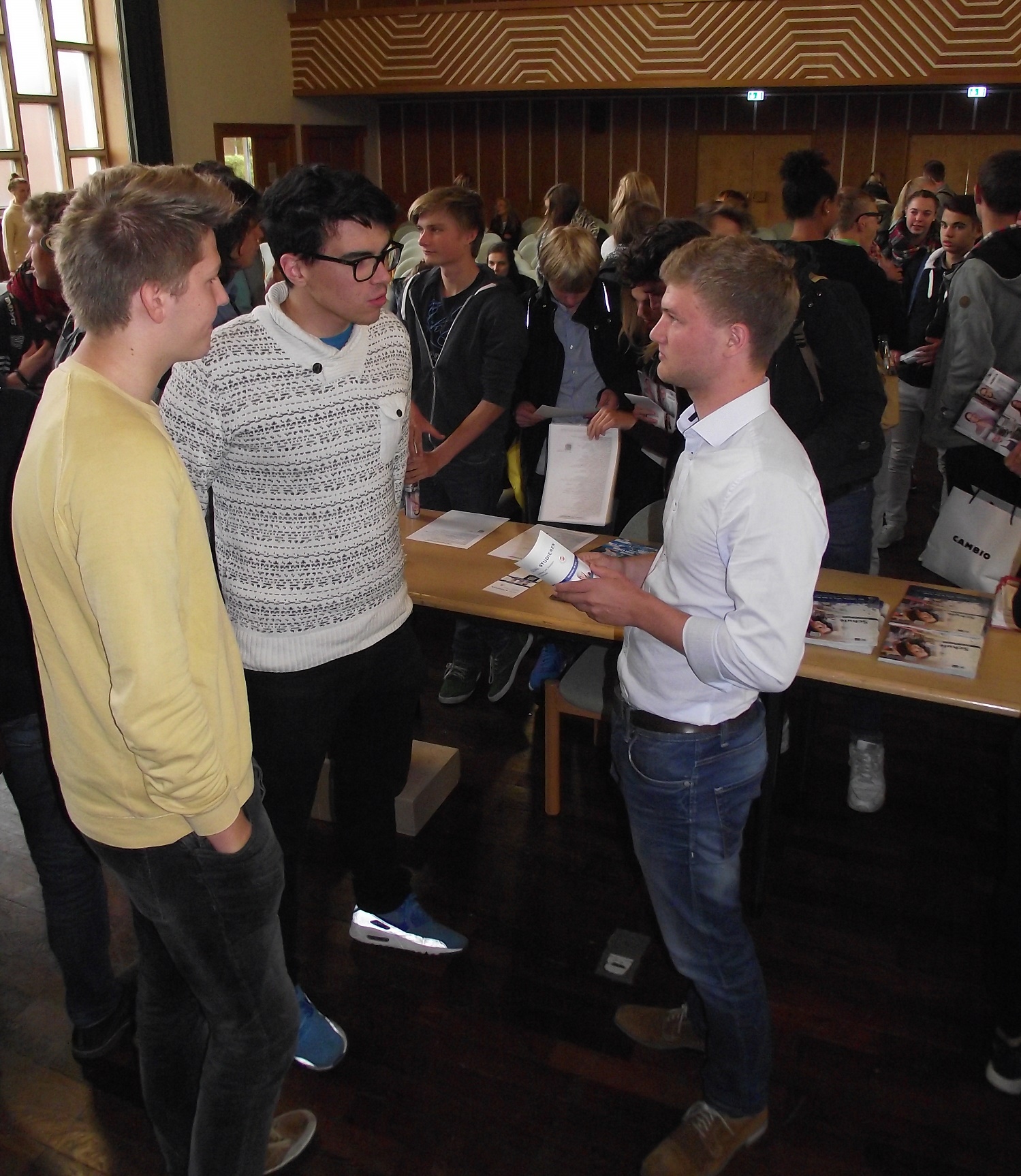 Drei sogenannte „Ausbildungsbotschafter“, Jonas Borchard, dualer Student bei Zeiss, Eduard Morosow, angehender Bankkaufmann bei der VR-Bank und Katrin Henniges, die eine Ausbildung zur Industriekauffrau bei der Mahr GmbH absolviert, berichteten souverän und kenntnisreich – von kurzen Powerpoint-Präsentationen unterstützt – von ihren Erfahrungen mit dualen Studien- bzw. Ausbildungsgängen. Besonderes hatte in diesem Zusammenhang Frau Henniges zu berichten, die zweieinhalb Monate ihrer Ausbildung bei Mahr France in der Nähe von Paris absolviert hat und damit ein ganz spezielles Zertifikat erwerben konnte, den Europass. Im Anschluss stellten sich die Botschafter der ungewöhnlichen Art den sehr zahlreichen Fragen, ein Zeichen, dass ihre Vorträge offensichtlich großes Interesse geweckt hatten.