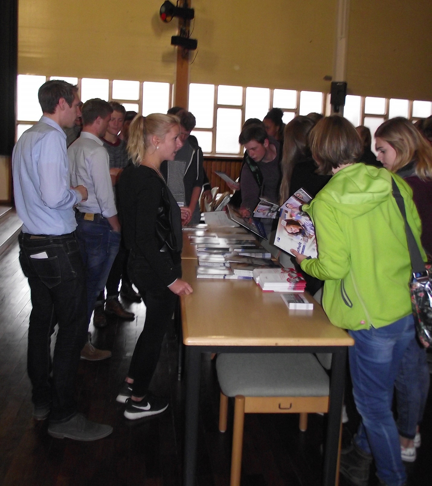 Unterstützt wurde sie dabei von Sina Stahl von der IHK Hannover, Jens Schmidt, Geschäftsführer der Berufs- und Verwaltungsakademie Göttingen sowie Marcus Bremer, Berufsberater der Arbeitsagentur und Begleiter bereits zahlreicher Generationen von Abiturienten unserer Schule, die grundlegende Informationen zu diesem Studiengang gaben und so vielleicht den Unentschlossenen bei ihrer Entscheidung helfen oder die Entschiedenen in ihrer Wahl bestätigten konnten.