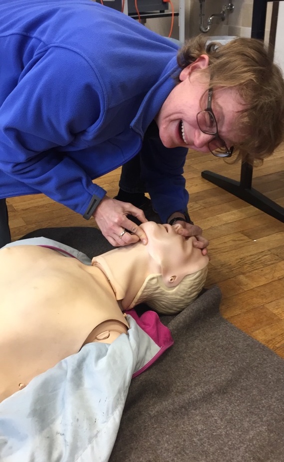 Ohne Holpern hatten sich alle Beteiligten schnell in die neuen Rollen gefunden – wir waren (ziemlich) brave Schülerinnen und Schüler, während Nicolas souverän – und nicht ohne liebevolle Strenge – durch den achtstündigen Kurs führte. Acht Stunden, die wider Erwarten rasch vergingen, denn Theorie und Praxis wechselten sich ab und bei aller Ernsthaftigkeit hat unser Hantieren an Übungspuppe Anne oder DS-geschultes Rollenspiel doch den einen oder anderen Lacher erzeugt …