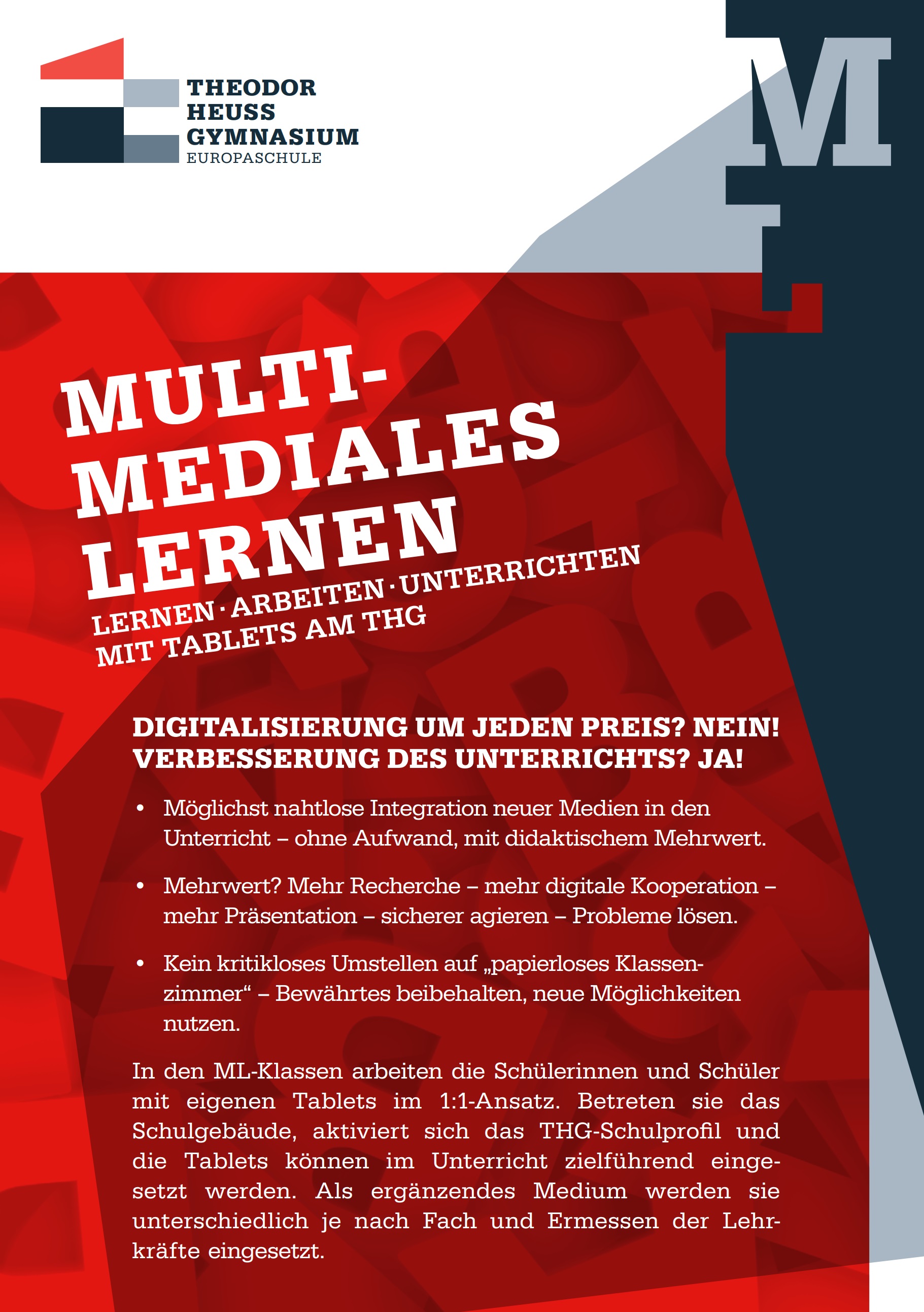 Zukunft? Eigentlich nicht – denn bereits seit einem Jahr läuft am THG das ML-Projekt (Multimediales Lernen) einer mit iPads ausgestatteten 9. Klasse. Nach positiven Rückmeldungen aller Beteiligten wird das Projekt weiter ausgebaut und im neuen Schuljahr auf eine Klasse des künftigen Jahrgangs 11 ausgeweitet. Hier sammeln die beteiligten Kolleginnen und Kollegen wichtige Erfahrungen; didaktische Konzepte und fundierte Positionen zum Thema Digitalisierung im Unterricht entstehen.