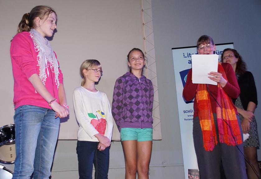 In der Kategorie "Autorinnen und Autoren von 11 bis 13 Jahren" standen am Freitagabend, dem 24. April, im Goetheinstitut drei Schülerinnen der 7BIL auf dem Siegertreppchen, als die Gewinner des Schreibwettbewerbs der Göttinger Schülerlesetage unter dem Motto "Gute Seiten – Schlechte Seiten" ausgezeichnet wurden. Von links nach rechts sind auf dem Foto Malin Wulf, Raphaela Alt-Epping und Elisa Hennigs zu sehen. Daneben freut sich die Illustratorin Lia A. Eastwood mit den glücklichen Autorinnen, die auch das Bild, das die Erstplatzierte Elisa in Händen hält, gemalt hat. Dargestellt sind auf einer Nacht- und einer Tagseite zwei Krebse, als Anspielung auf Elisas Geschichte, die sehr einfühlsam und anschaulich von der Krebserkrankung eines jungen Mädchens erzählt.
