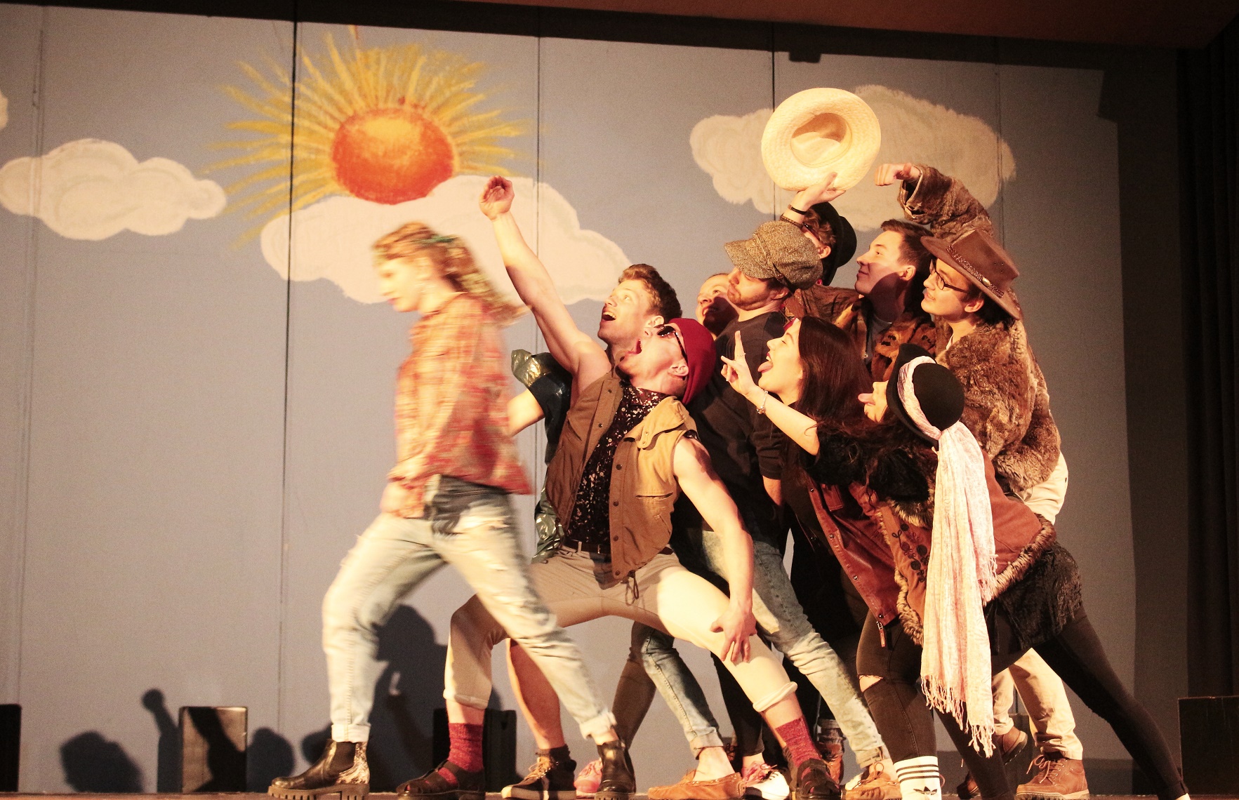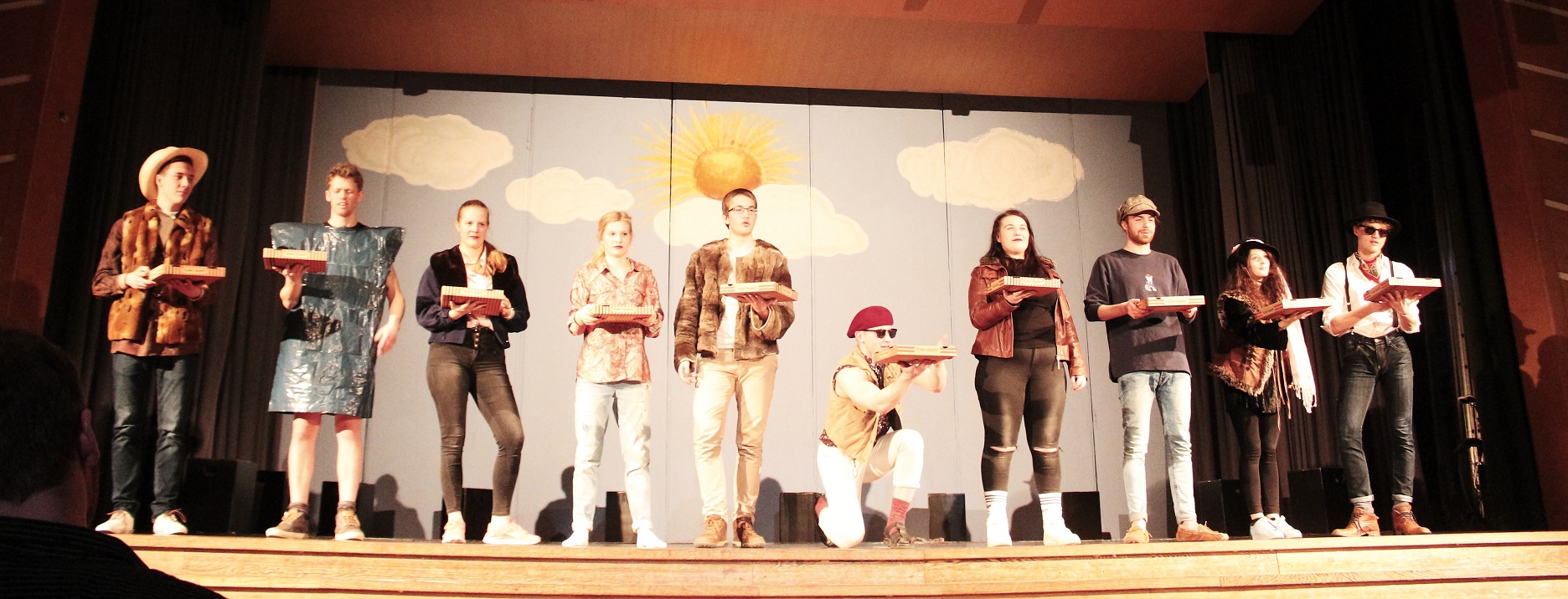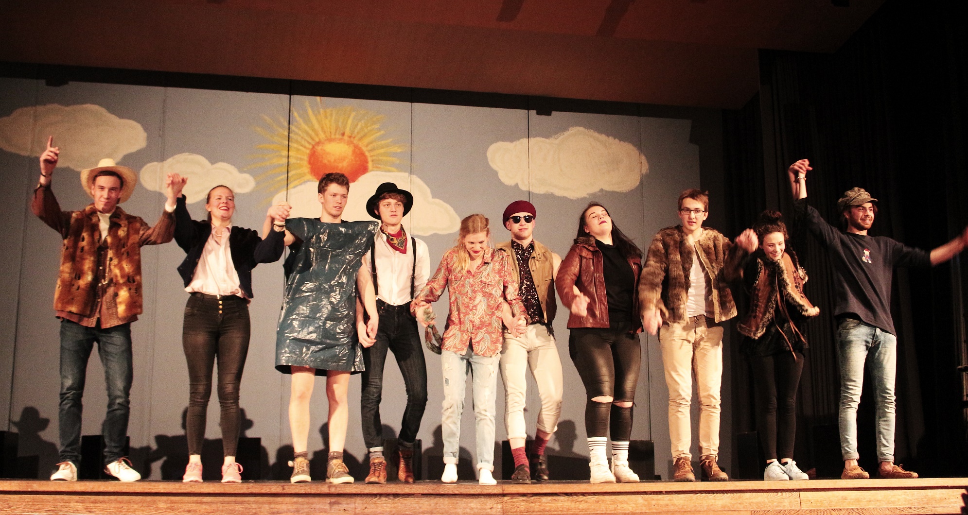 Mit diesem Credo der Gesellschaft haben sich zehn Abiturienten seit Herbst in einer Theater AG beschäftigt und nun in einer abwechslungsreichen Collage unter dem Titel „#selbst du sei“ auf die Bühne gebracht. Mit gewollt origineller Kostümierung spielen sie auf verschiedenen Ebenen das Mantra der Selbstverwirklichung durch: ironisch und witzig, bissig und politisch inkorrekt, aber auch selbstverliebt und melancholisch. Wie ein Refrain zieht sich dabei Robert Gernhardts „Gebet“ durch die Szenen, in dem es am Ende heißt: „Preise künftig meinen Namen/ denn sonst setzt es etwas. Amen“. Mal wird es pathetisch, mal kindlich, mal erotisch und aggressiv vorgetragen. Die Geschöpfe empfinden sich selbst als Schöpfer und laden zum Schluss Priestern gleich ihr Publikum – mit „Werthers Echten“ – zum Abendmahl ein: „Nimm es hin/dass ich was Besond‘res bin“.