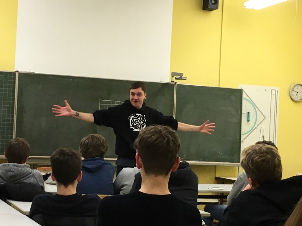 „Ich heiße Jonas Brandt. Ich war auch mal auf dieser Schule, und genau das hier war mein Klassenzimmer. Ja, genau. Hab aber nicht fertig gemacht. Kam was dazwischen. […] Da war ich genauso alt, wie ihr jetzt seid.“