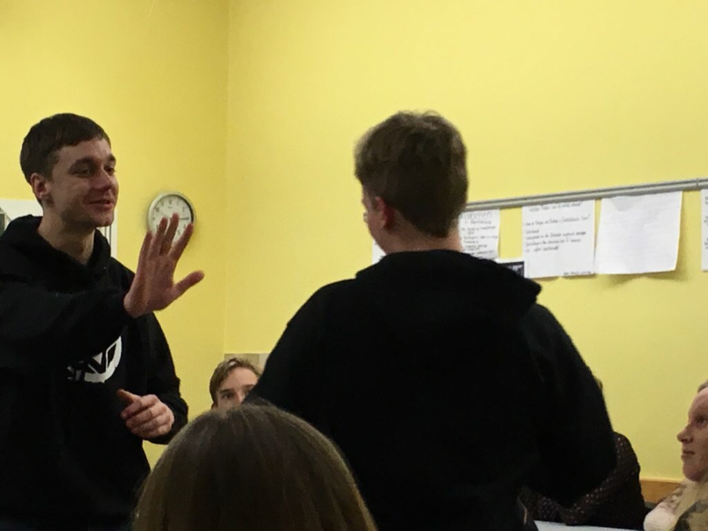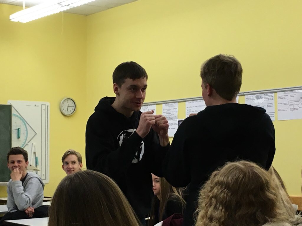 Der Schauspieler Roman Majewski vom Deutschen Theater erreicht von Beginn an die 26 Schülerinnen und Schüler der Klassen 10EU2 und 10BIL und kann sie für seine Geschichte zu interessieren. Sehr natürlich und authentisch gelingt es ihm, seine Figur und ihre Geschichte im neonbeleuchteten Klassenzimmer zu erzählen. Sparsam dosiert setzt er auf Interaktion – so soll Linus die Zeit im Auge behalten und ihm kurz als Sparringspartner beim Boxen dienen und Nico muss als Alter Ego herhalten, als er nachspielt, wie ihn sein Boxtrainer angebrüllt hat.