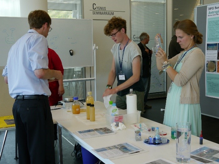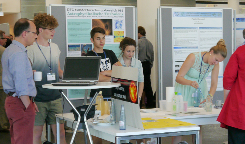 Manchmal braucht eine Information ein bisschen länger, ehe sie den Auftritt im Licht der Öffentlichkeit wagt und deshalb war es bereits im letzten Jahr, als unsere Oberstufenschülerinnen und – Schüler Julius, Marten, Dimitrios, Lea und Carolin (alle Q2) Experimente zur Fluiddynamik des Sonderforschungsbereichs „Astrophysikalische Strömungsinstabilitäten und Turbulenz“ (SFB963) am Max-Planck-Institut für Sonnensystemforschung vorstellten. Dabei erklärten sie, wie diese Experimente im Unterricht zum Beispiel im letztjährigen mathematisch-naturwissenschaftlichen Vorkurs unter ihrer Mitwirkung zum Einsatz kamen. Bereits vor Ort erhielten sie einige sehr erfreuliche Rückmeldungen. Die teilnehmenden Wissenschaftler waren beeindruckt von dem Enthusiasmus, mit dem die Schülerinnen und Schüler die Experimente durchführten und kompetent erklärten.