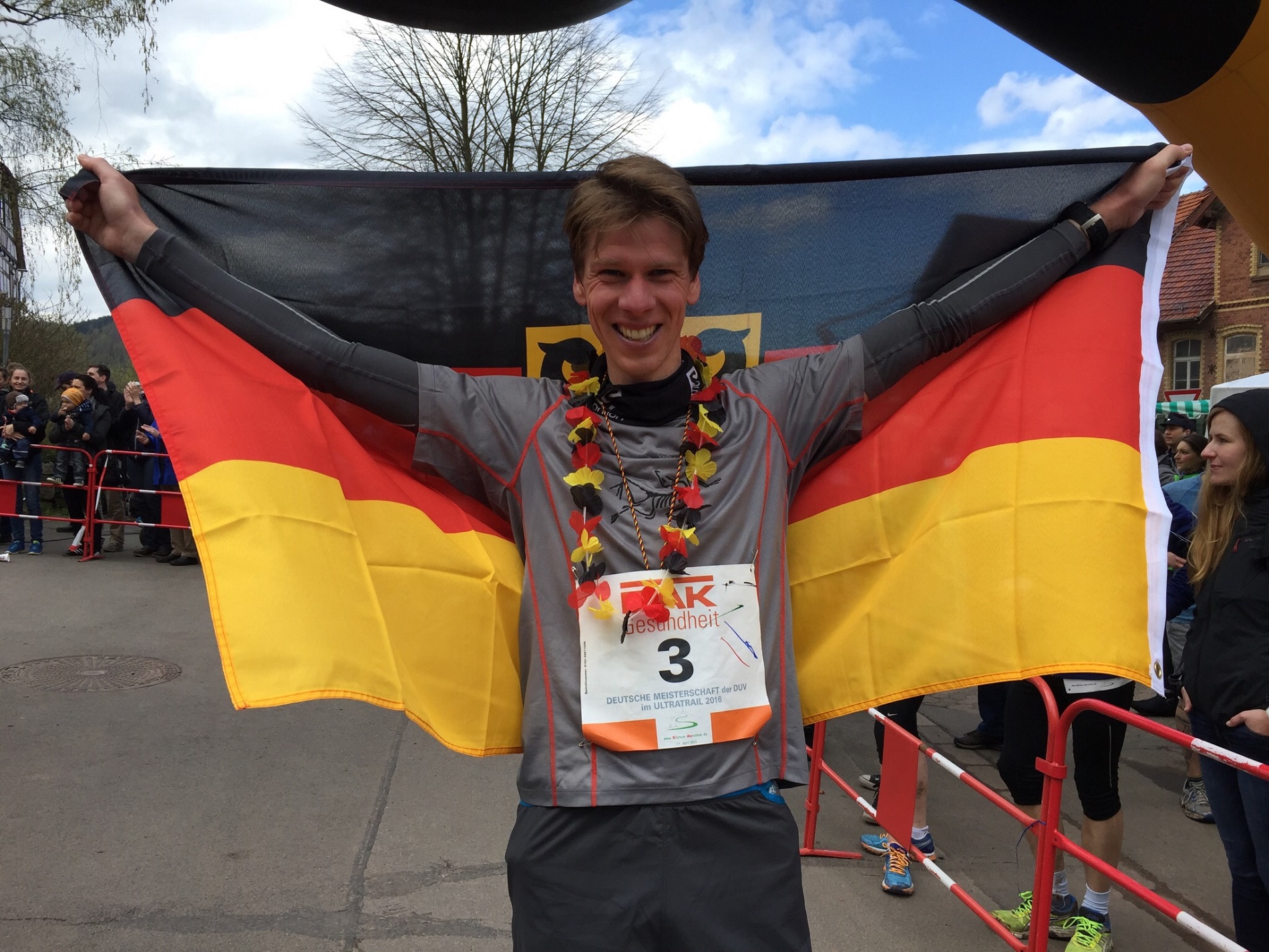 Nachdem es ihn in den letzten Jahren immer mehr in die Berge gezogen hat – zu immer längeren Rennen mit immer mehr Höhenmetern – ist er am Sonntag, dem 17. April, erstmals bei der Deutschen Meisterschaft im Ultratrial gestartet: über 65 km galt es 1700 Höhenmeter zu überwinden, das Ganze auf schmalen Pfaden mit wunderschönen Ausblicken auf den Hohen Meißner und den Bilstein. Dass dabei gleich der Deutsche Meistertitel herauskommt, hätte sich Florian Reichert nach eigenen Aussagen „so nicht träumen lassen“, „aber an diesem Tag kam einfach alles zusammen, vom ersten Meter an habe ich mich gut gefühlt, meinen Rhythmus gefunden (was sehr wichtig ist auf solch langen Distanzen), und konnte mich schon nach 17 km absetzen, so dass ich im Ziel sehr großen Vorsprung hatte“. Und was für einen: als Florian Reichert nach 4:29:03 Stunden das Ziel erreicht hatte, dauerte es noch mehr als 15 Minuten, ehe der Zweitplatzierte über die Ziellinie lief!